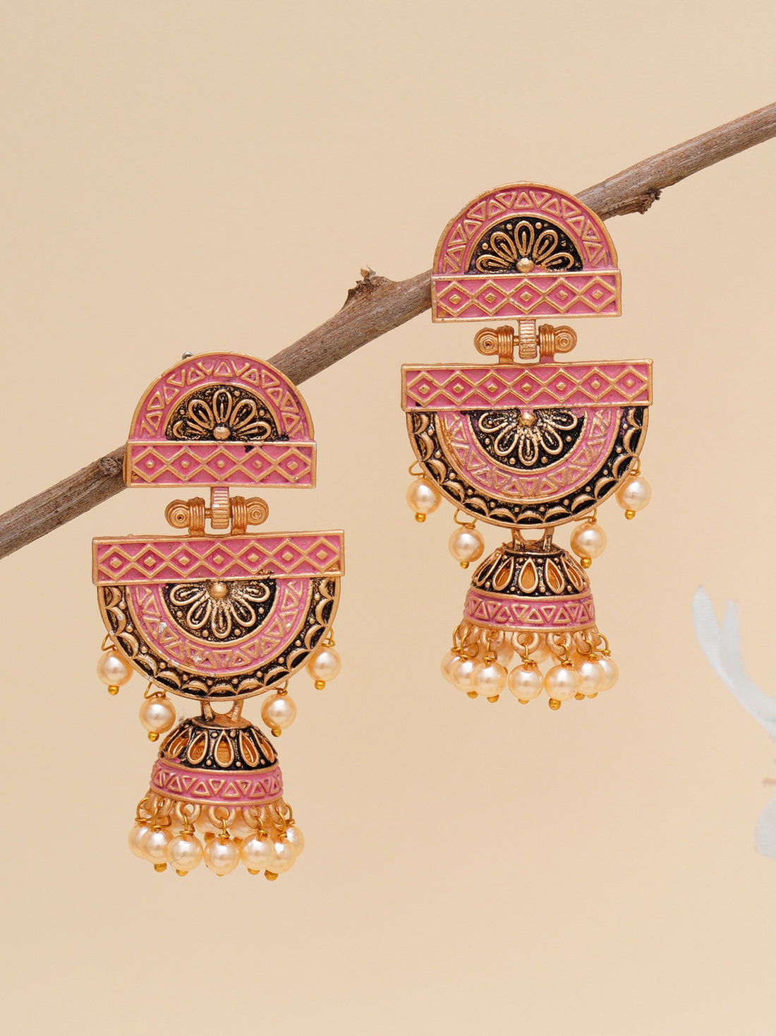 Karatcart Antique Gold Plated PinkTomb Style with Golden Pearl Jhumki Earrings for Women