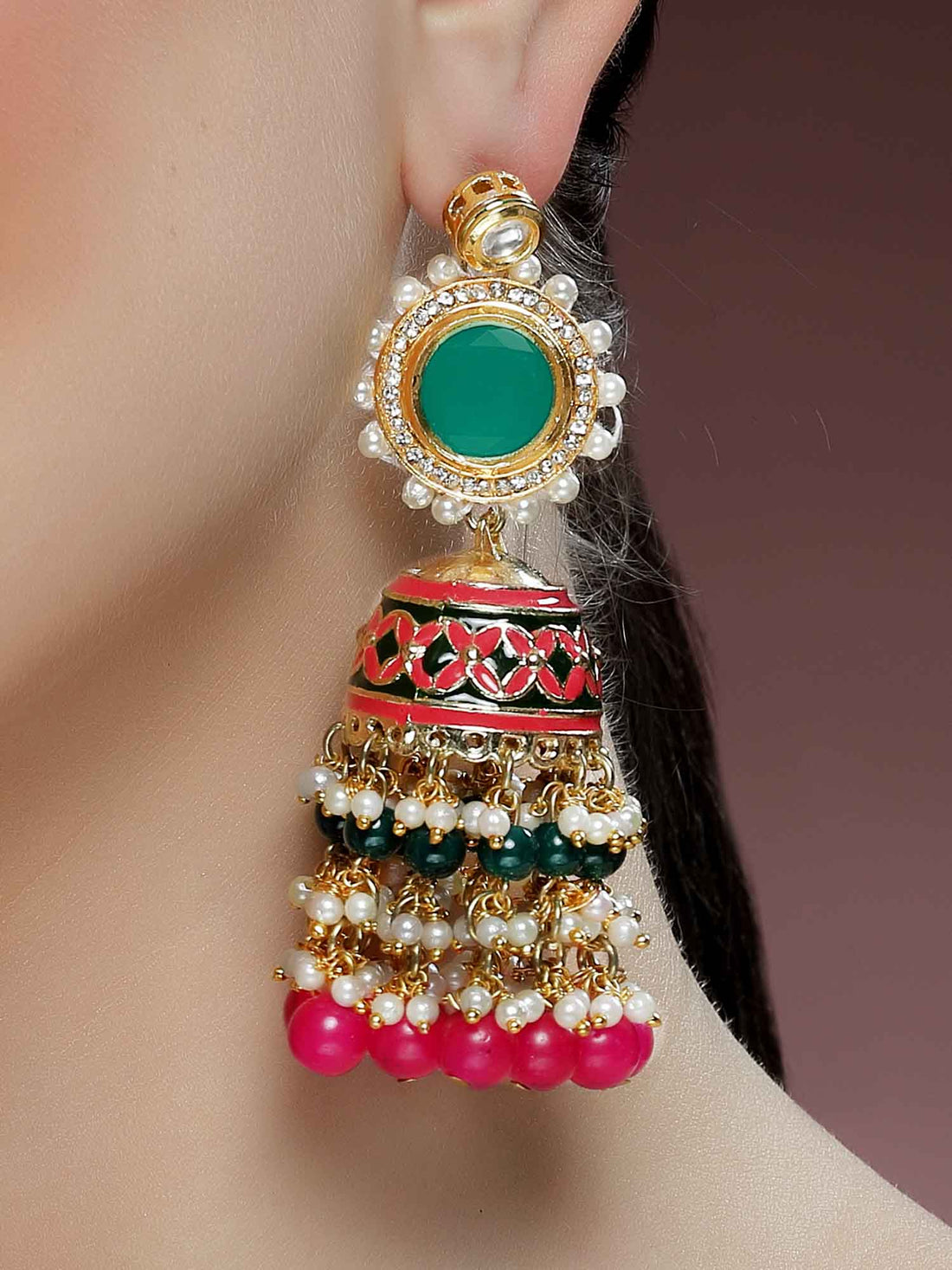 Karatcart Gold Plated Green and Pink Meena Polki Kundan Jhumki Earrings for Women