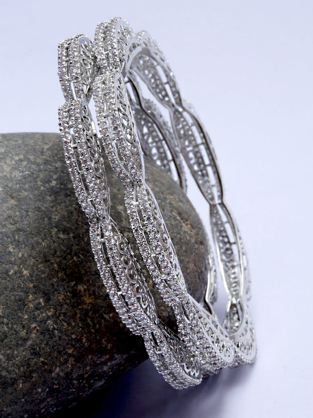 Silver Tone American Diamond Studded Bangle Set for Women. The bangle has intricate cutwork &...