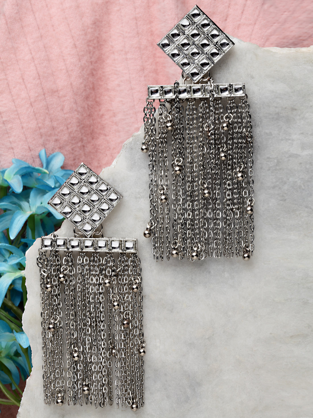 Karatcart Oxidised Silver Square Shape Kundan Tassel Earrings for Women