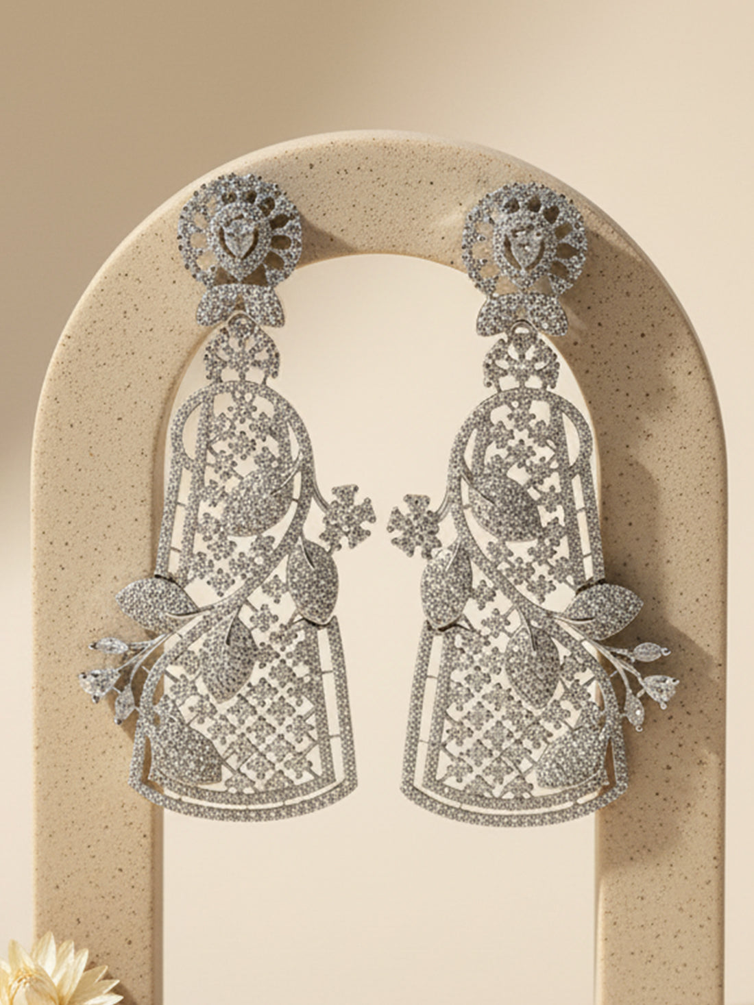 KARATCART Designer Silver-Plated Sparkling American Diamond Long Floral Drop Earrings for Women