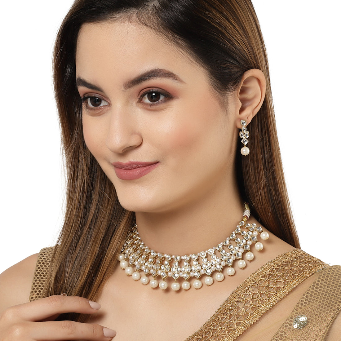 Gold -Plated White Kundan Studded & Pearl Beaded Choker Necklace Set