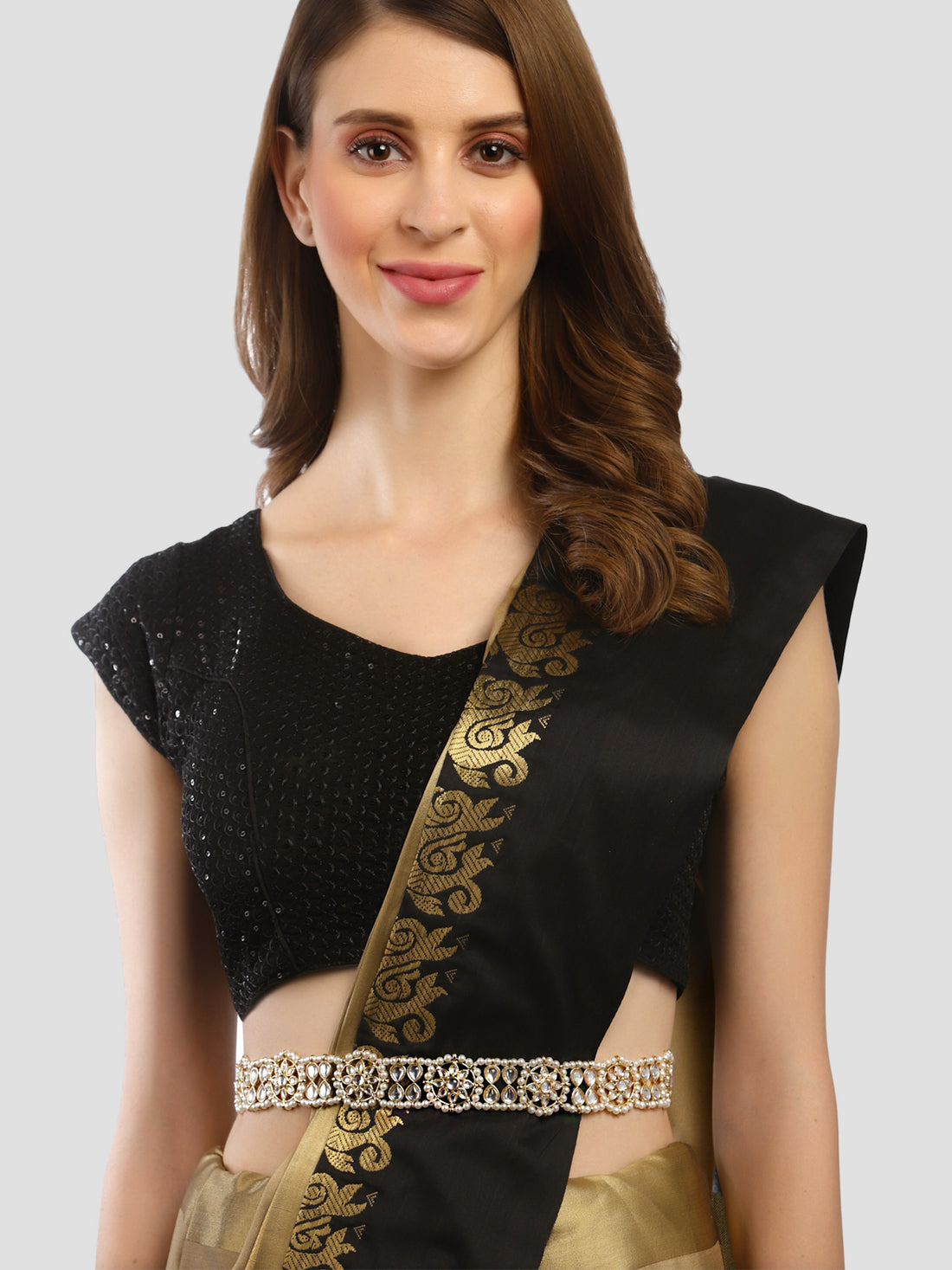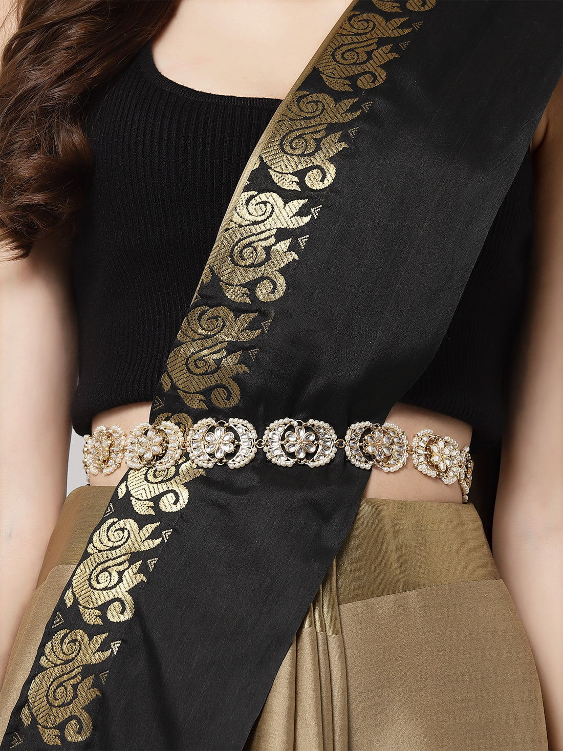 Karatcart Gold Plated Floral and Drop Shape Kundan and Pearl Beaded Kamarbandh