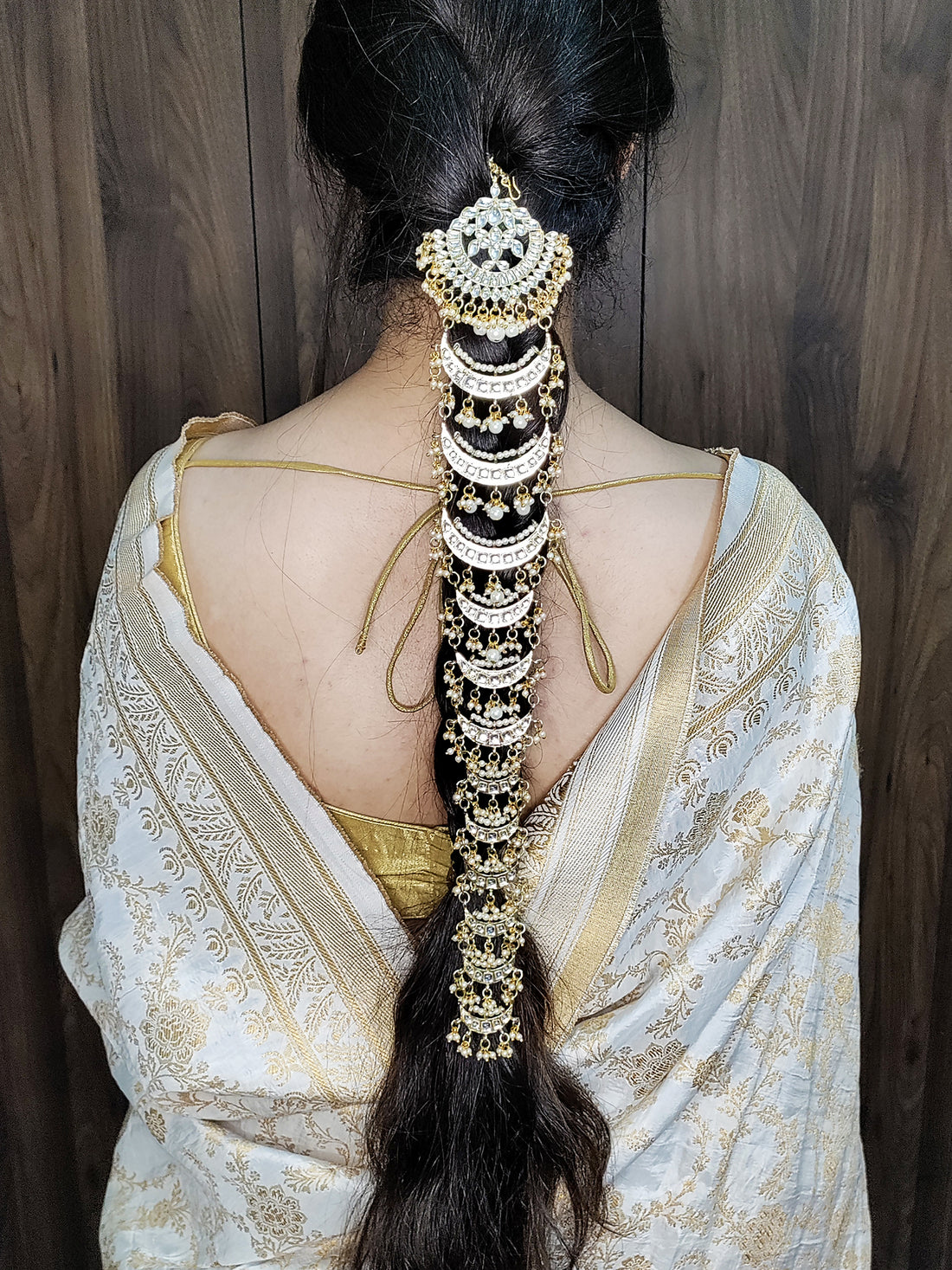 Karatcart Moon Shape Gold Plated Pearl and Kundan Studded Bridal Wedding Hair Braid Choti