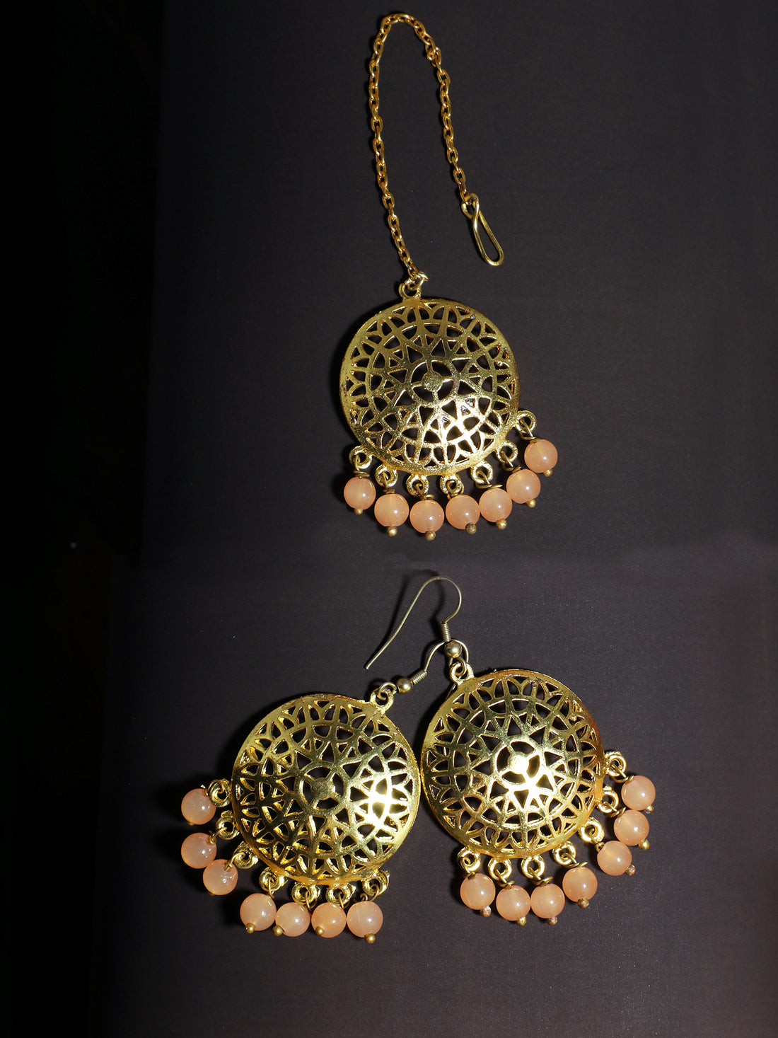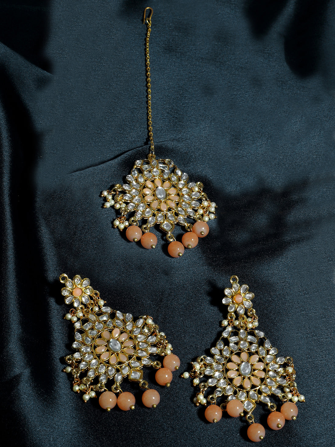 Gold Plated Peach Beads Kundan Dangler Earrings with Maangtikka for Women
