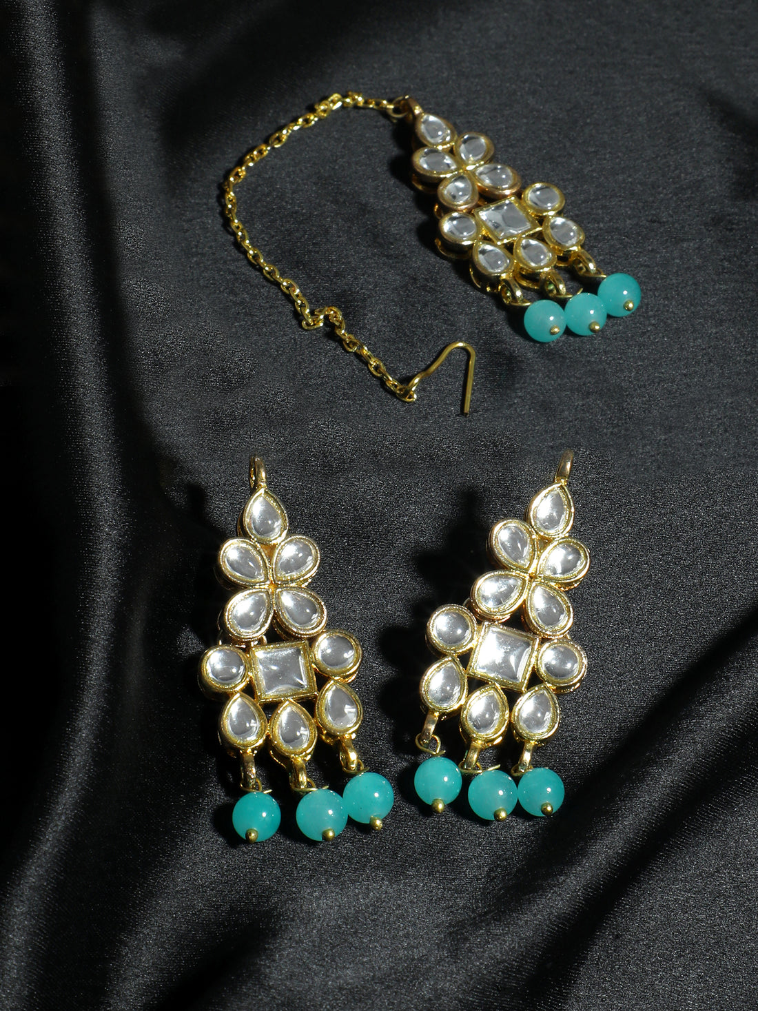 Gold Plated Mint Blue Beads Kundan Dangler Earrings with Maangtikka for Women