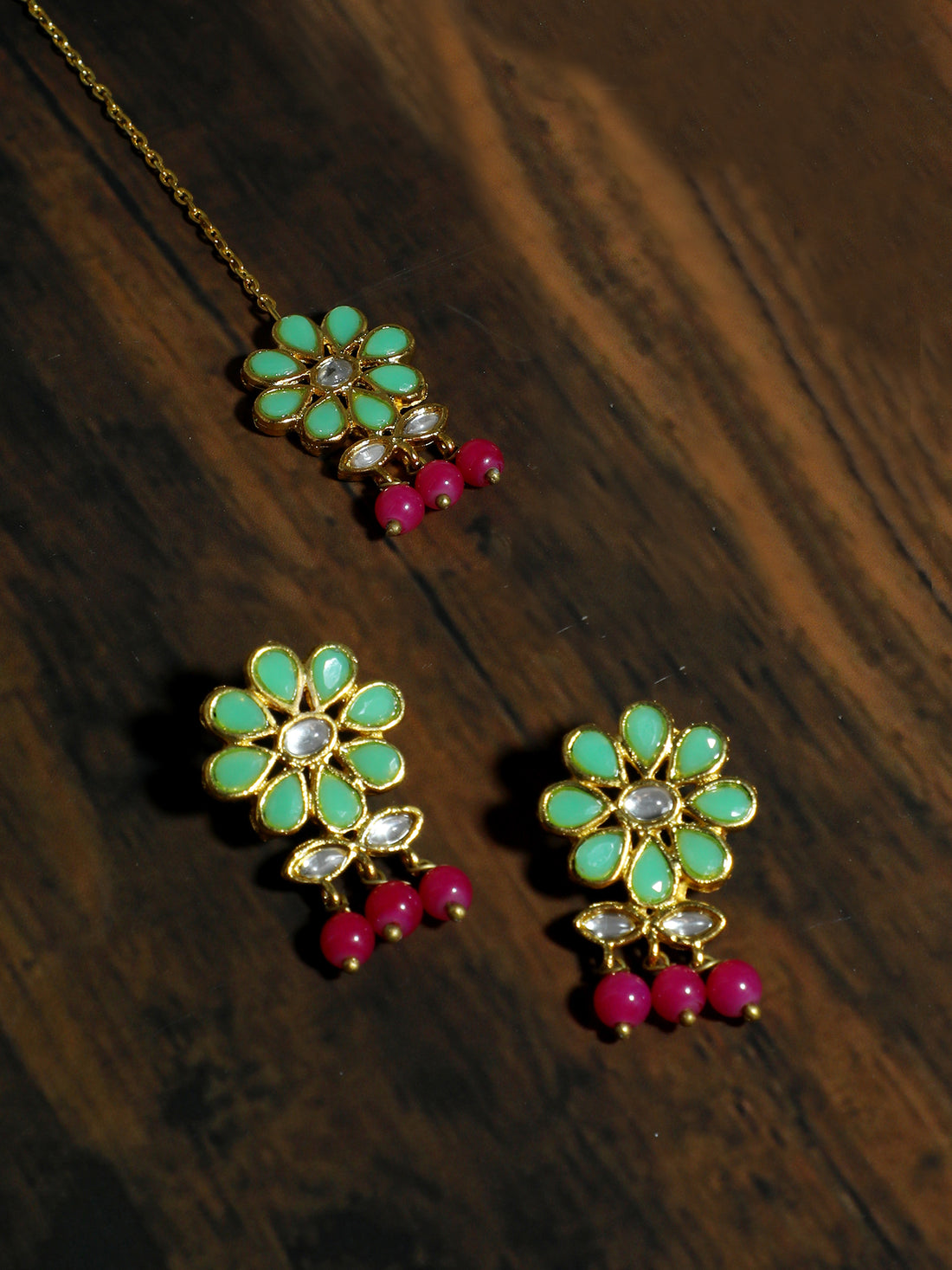 Gold Plated Mint Green Beads Kundan Dangler Earrings with Maangtikka for Women. It's Five Layer Micro...