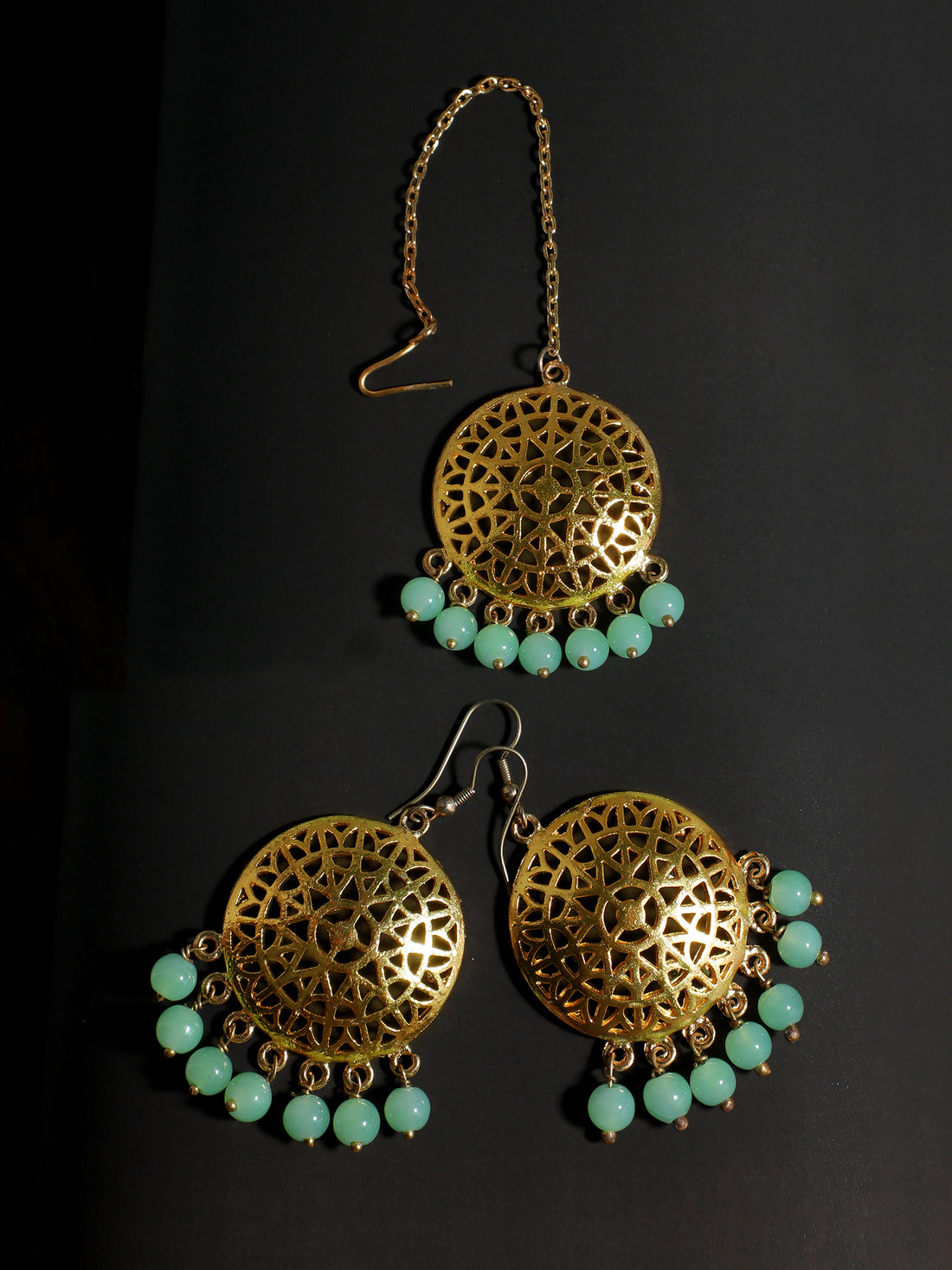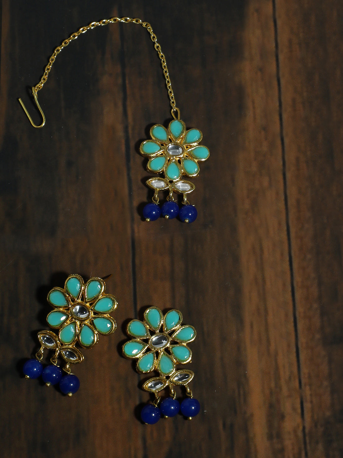 Gold Plated Blue Beads Mint Blue Kundan Dangler Earrings with Maangtikka for Women. It's Five...