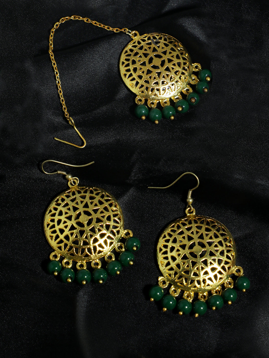 Gold Plated Green Beads Kundan Dangler Earrings with Maangtikka for Women