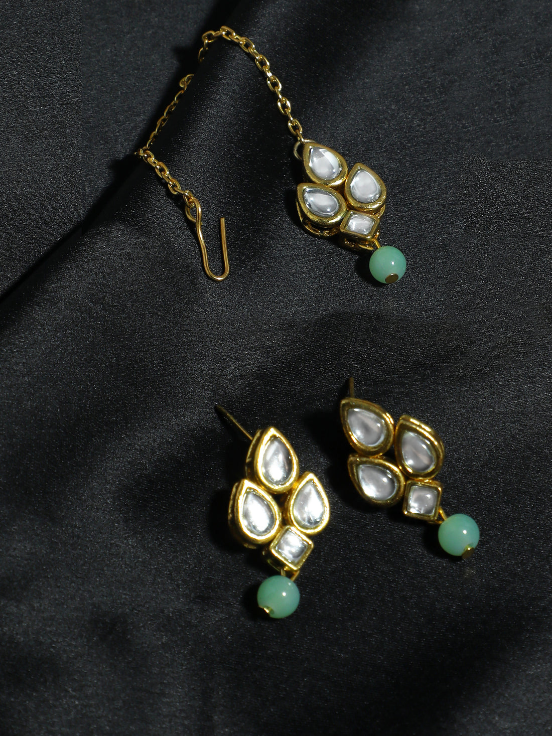 Gold Plated Mint Green Beads White Kundan Dangler Earrings with Maangtikka for Women