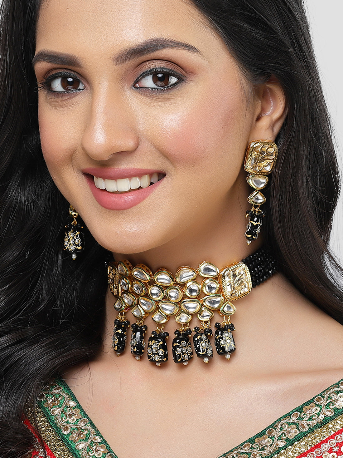 Karatcart Gold Plated Black Tumble and Polki Kundan Choker Necklace Set for Women