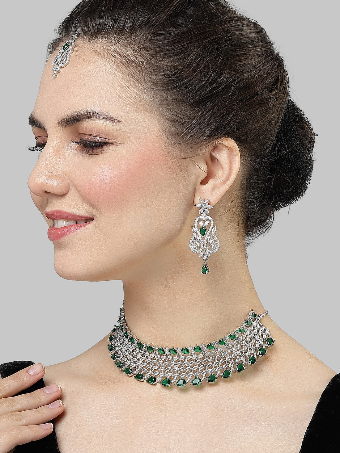Karatcart Green Cubic Zirconia Silver Plated Choker Necklace Set for Women