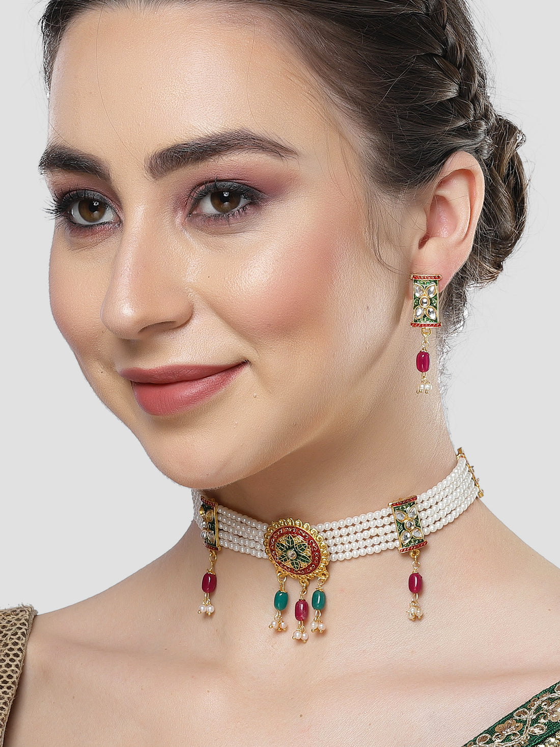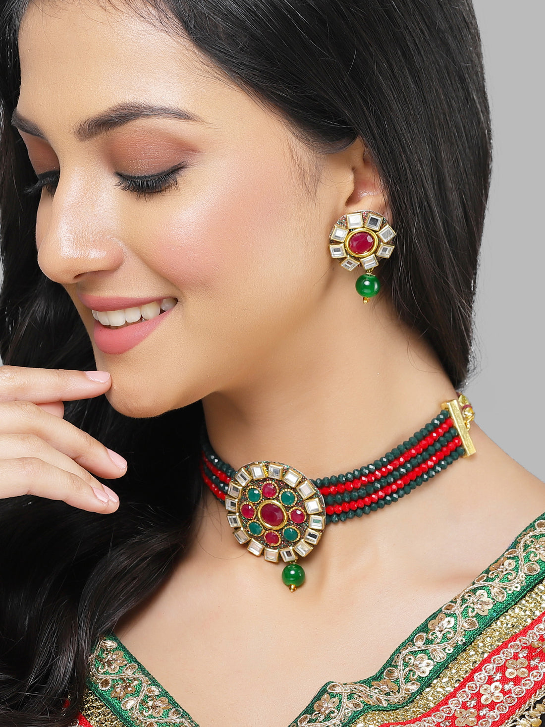 Karatcart Gold Plated Red and Green Crystal Studded Choker Necklace Set for Women