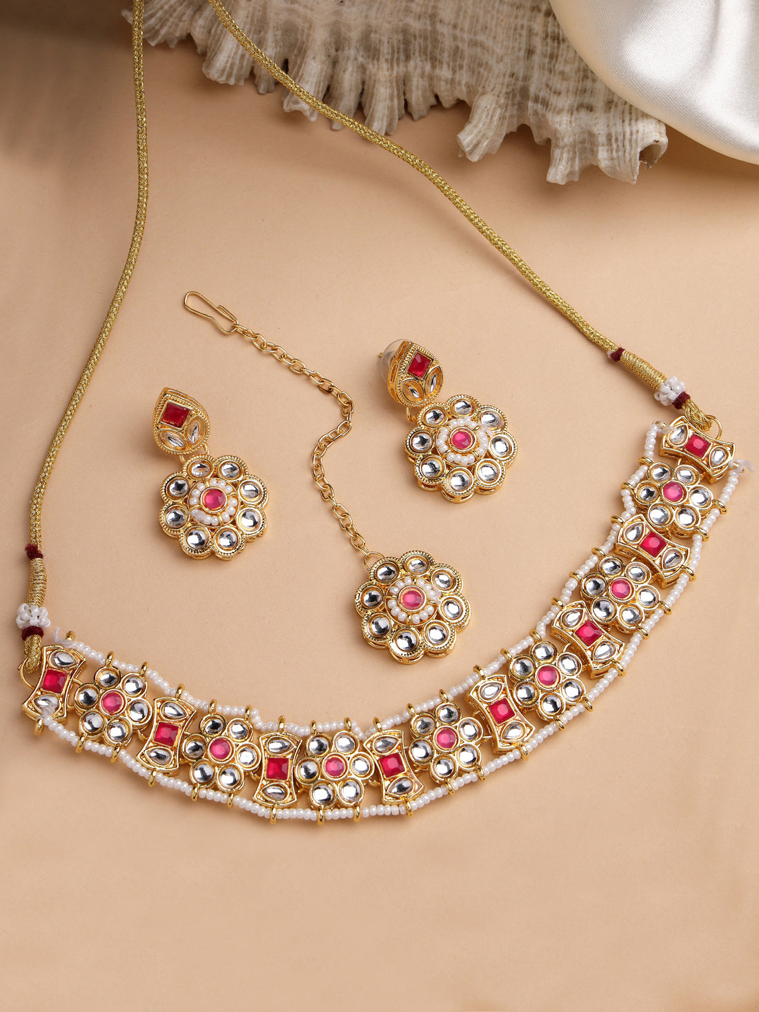 Karatcart Pink Beads Floral Design Kundan Choker Necklace Set for Women
