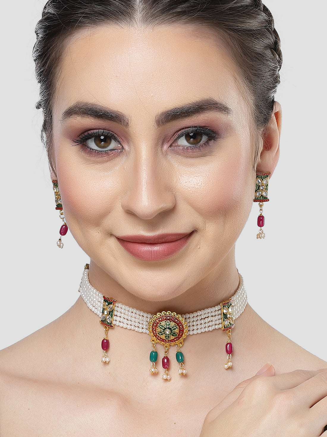 Karatcart Gold Plated Pink & Grey Meena Kundan Choker Necklace Set for Women