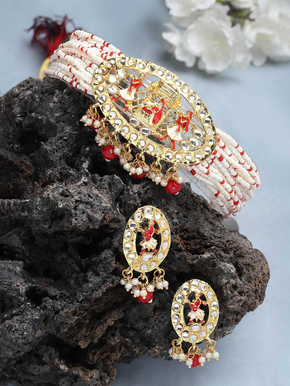 Karatcart White and Red Beaded Meenakari Choker Necklace Set for Women