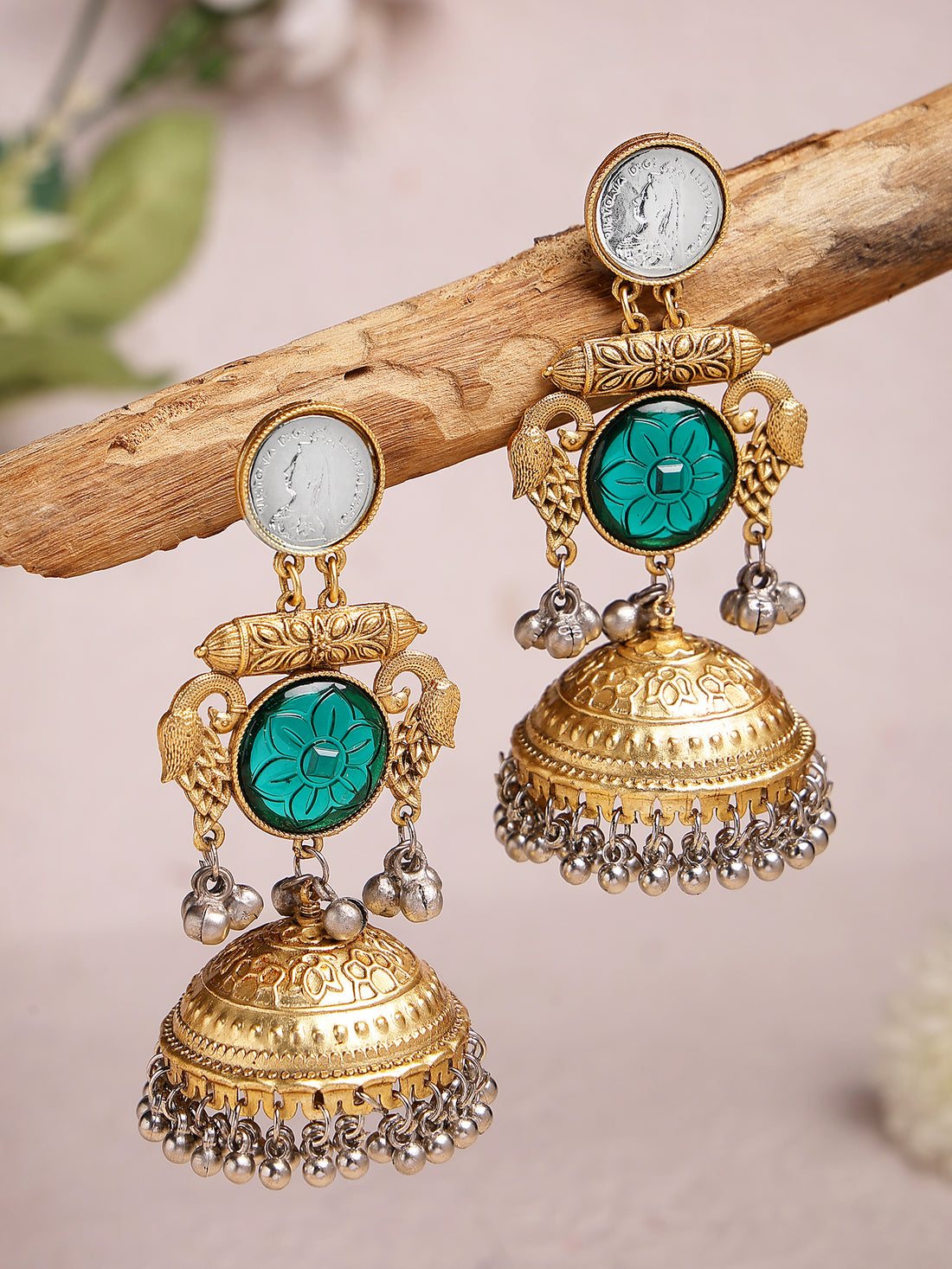 Karatcart Traditional Gold Plated Coin Jhumka Earrings with Green Stone and Bird Motif for Women