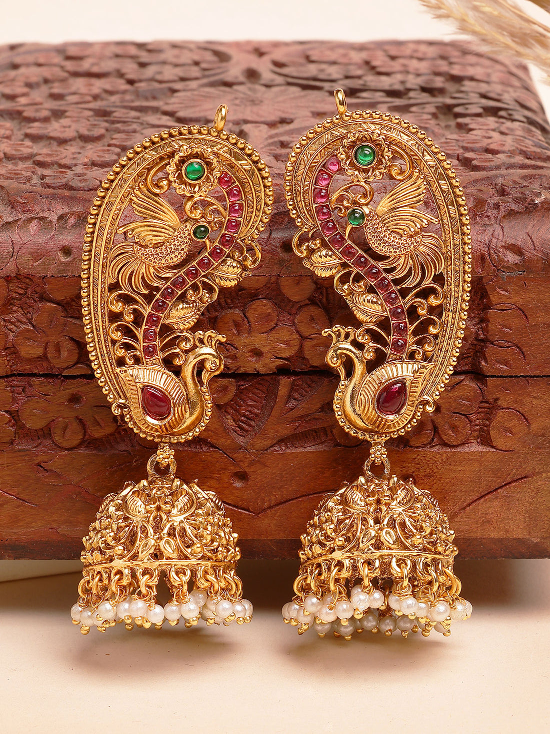 Karatcart Traditional Gold-Plated Red Stones Peacock Design Jhumka Earrings with Pearls for Women
