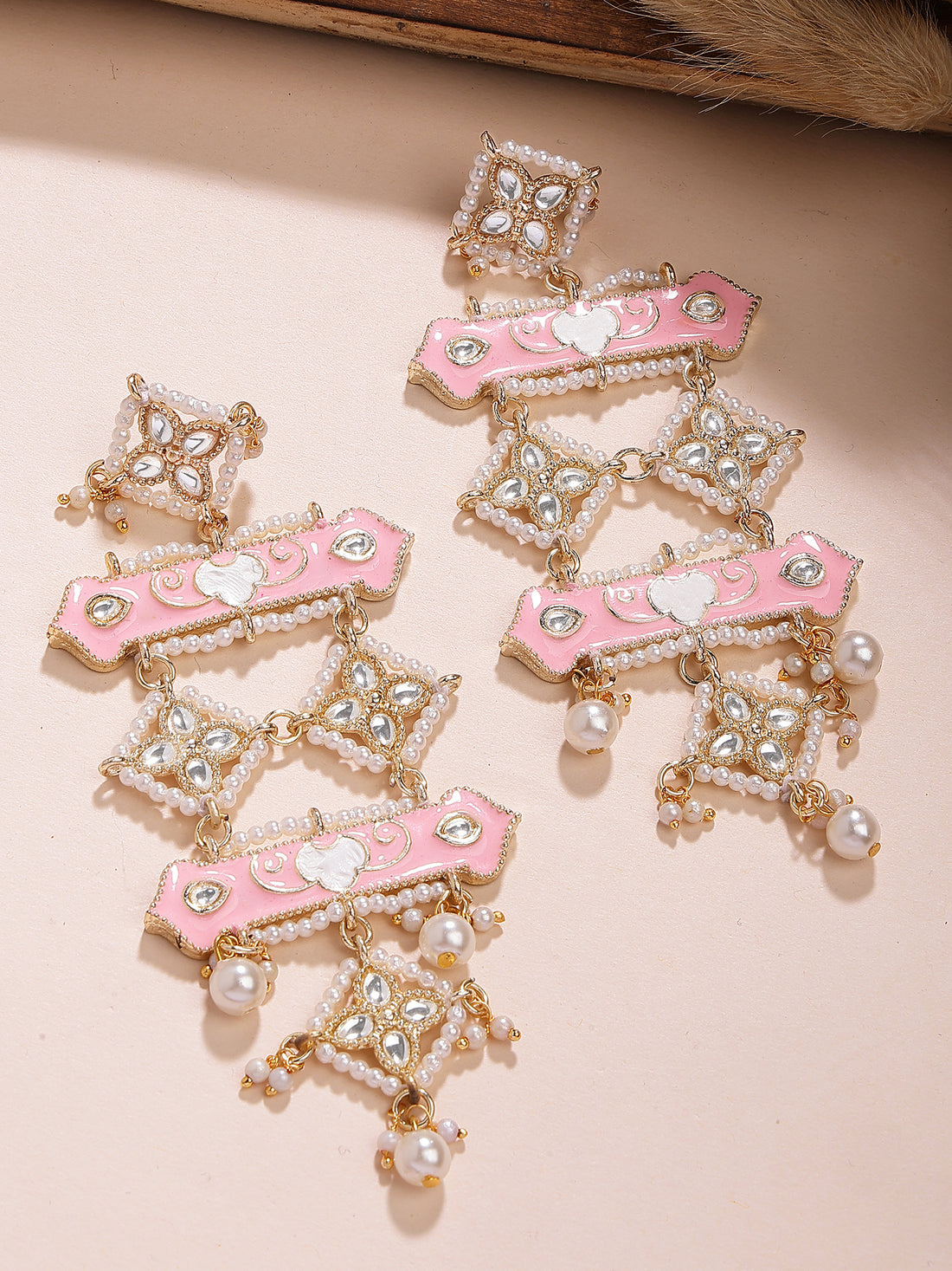 Karatcart Gold Plated Pink and White Enamel Kundan Pearl Dangler Earrings for Women