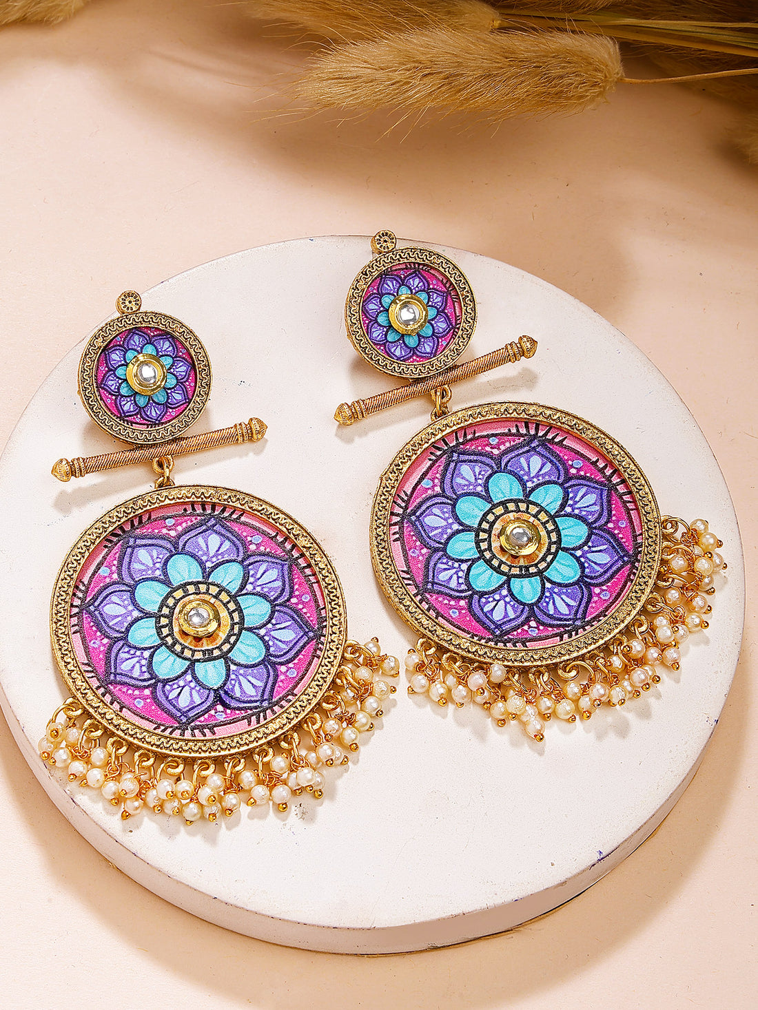 Karatcart Traditional Gold Plated Mandala Art Dangler Earrings with Pearls for Women