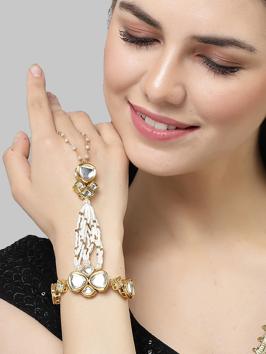 Karatcart Gold Plated Polki Kundan and White Moti Hathphool for Women