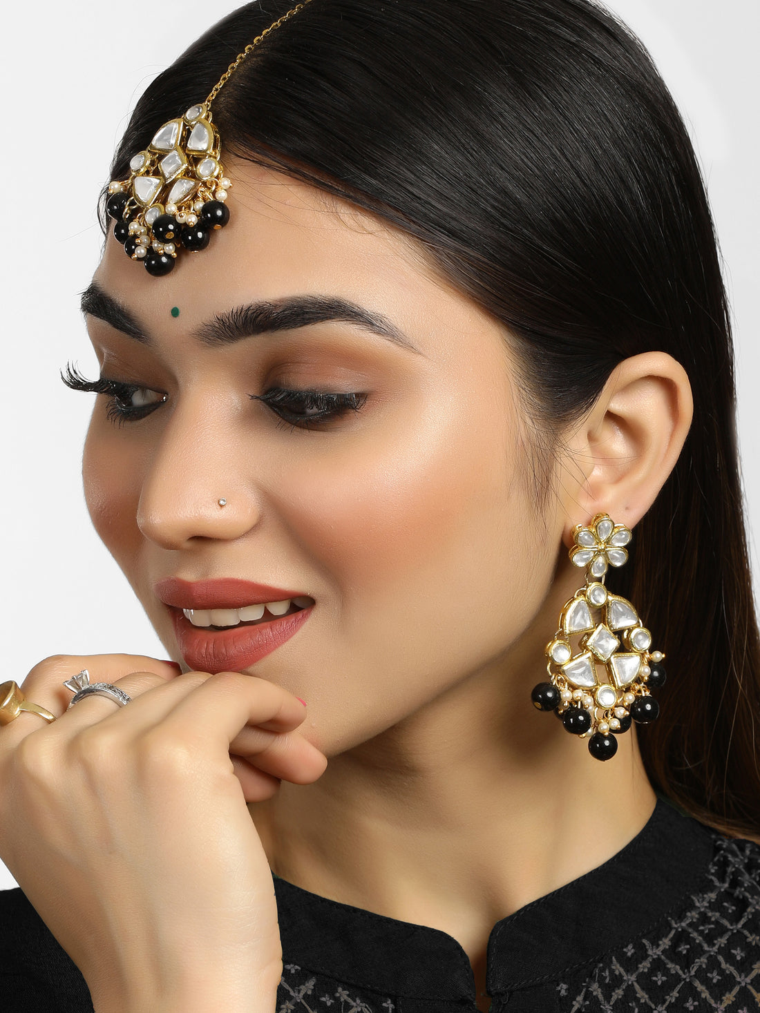 Black Beads Kundan Dangler Earrings with Maangtikka
