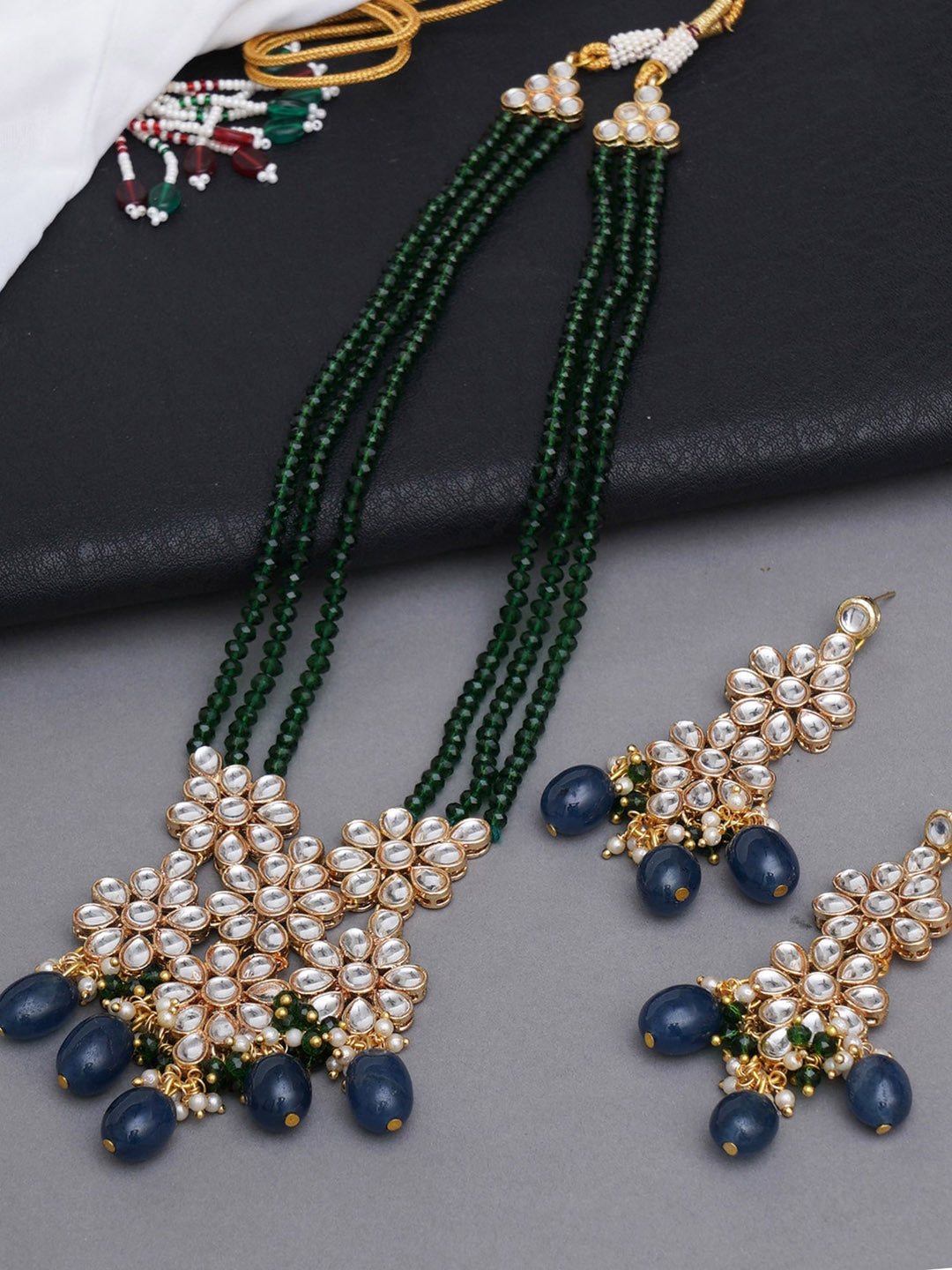 Gold-Plated Green Beads and Pearl Ball Studded Handcrafted Kundan Necklace Set