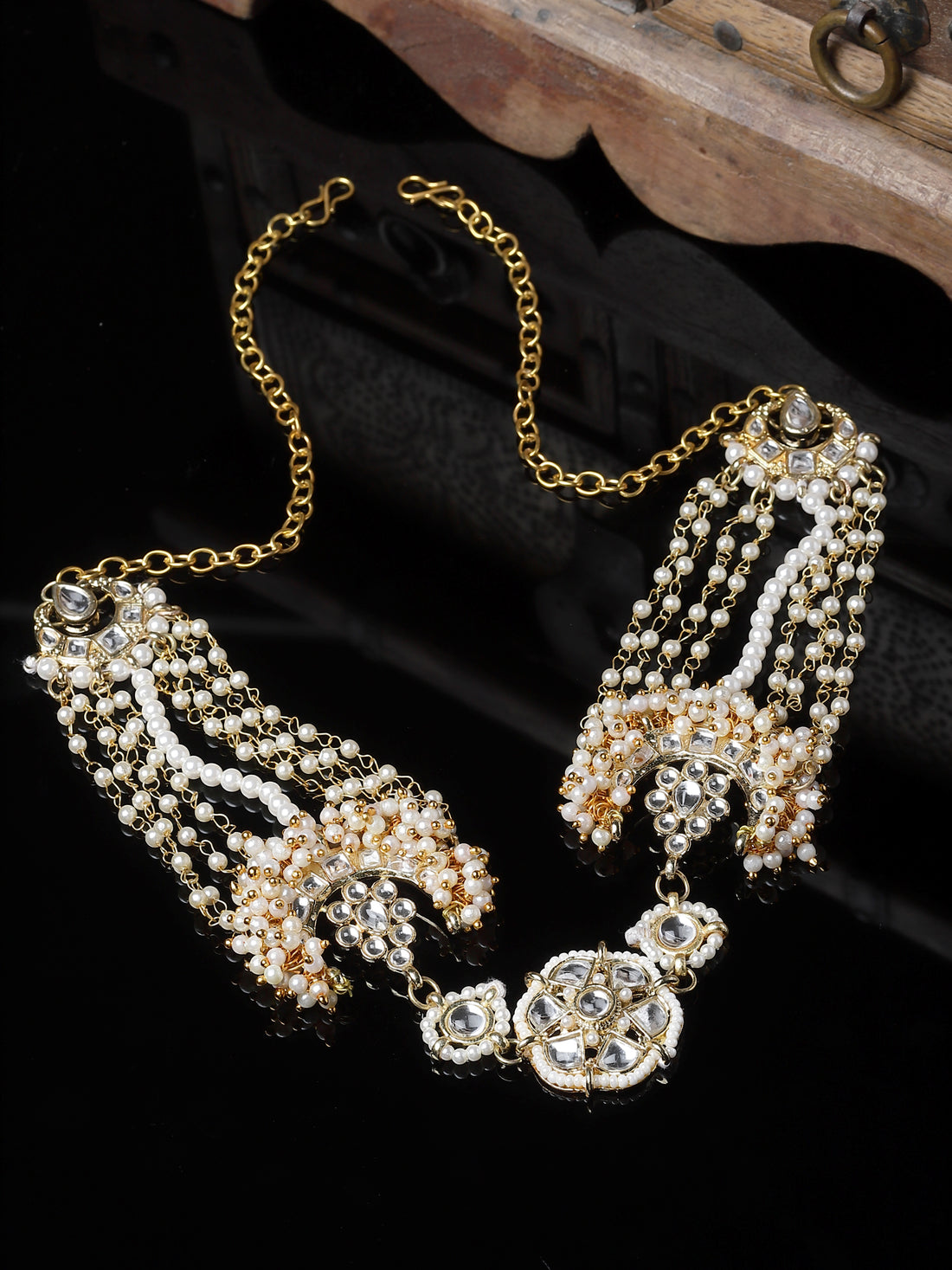 Karatcart Gold Plated Floral Design Pearl Chain and Kundan Studded Hairband for Women