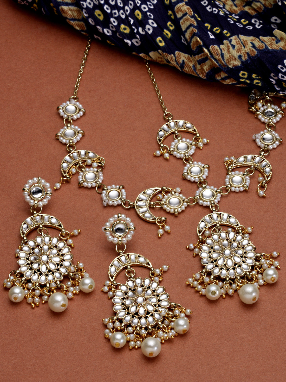 Karatcart Gold Plated Floral Kundan Earring and Mathapatti Set for Women