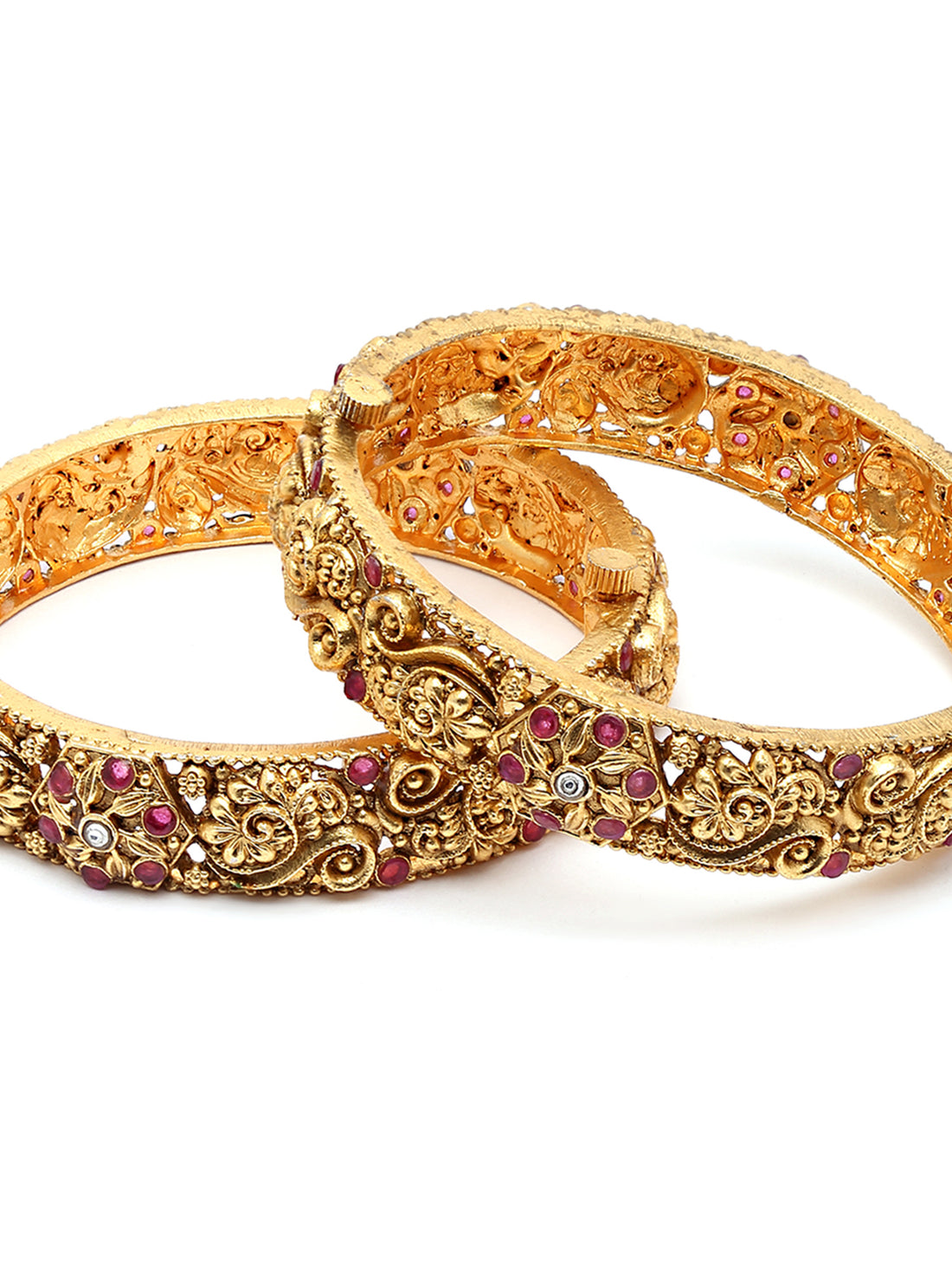 Karatcart Set of 2 Antique Gold Plated Red Stone Studded Rajwadi Temple Bangles for Women