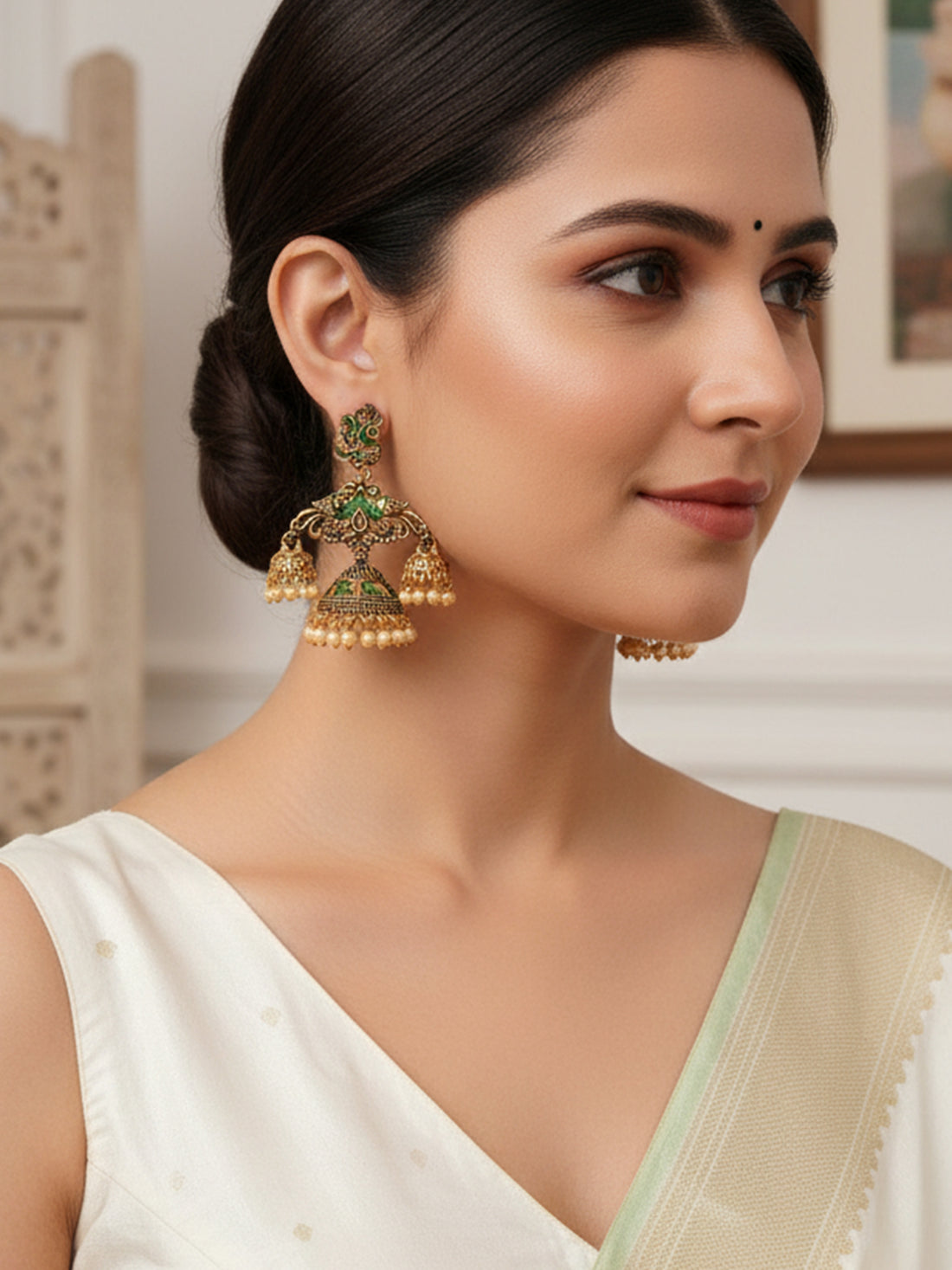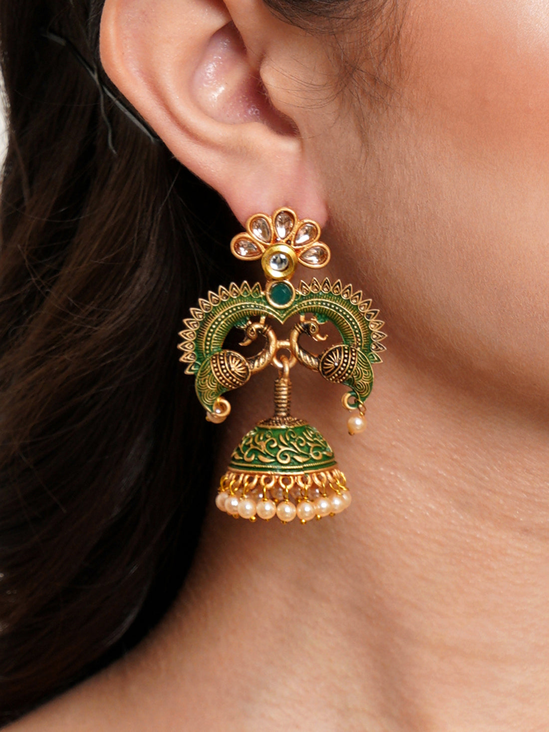Karatcart Antique Gold Plated Green Designer Peacock Jhumki Earrings for Women