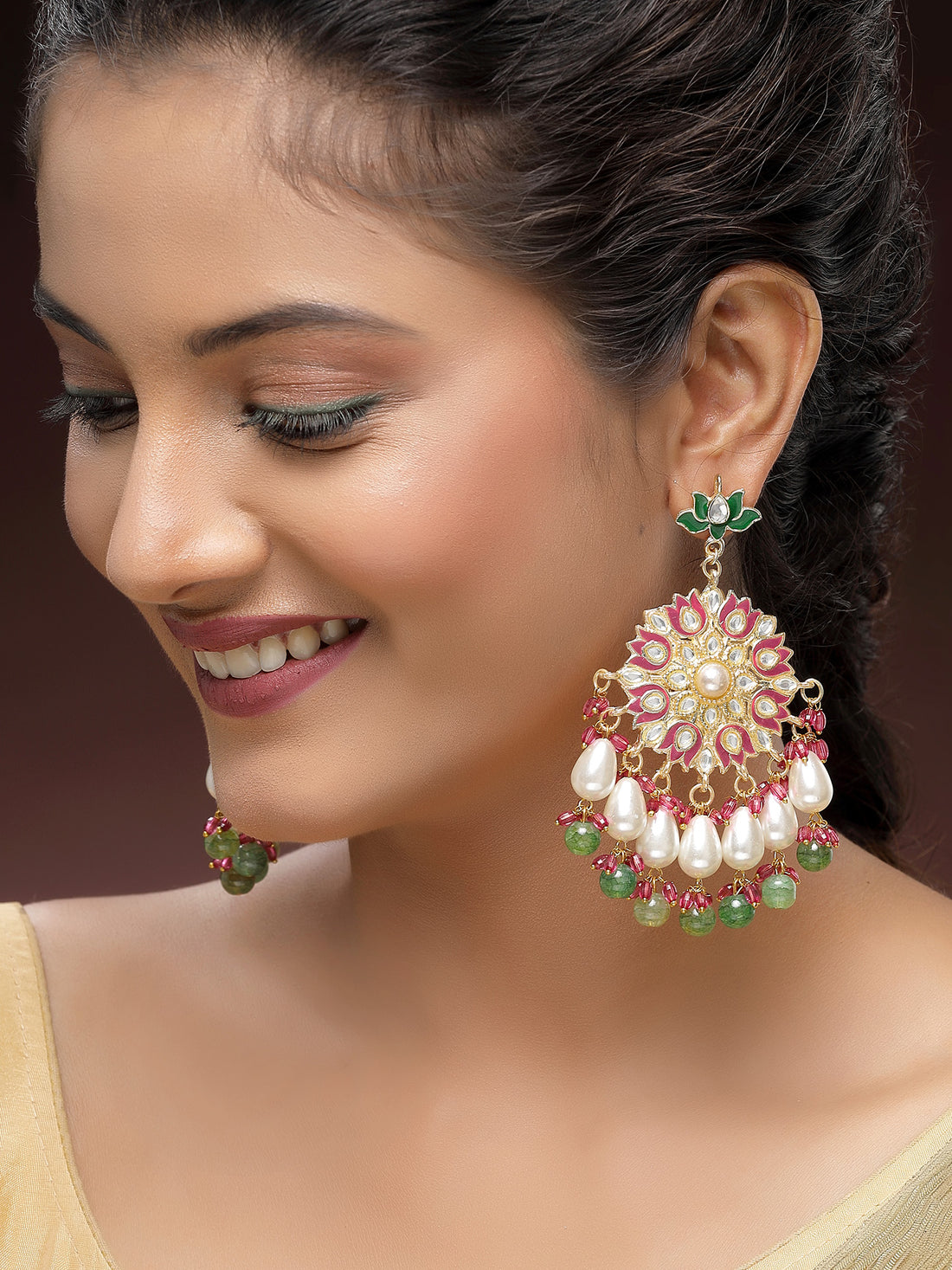 KARATCART Gold-Plated Floral Pink Meena Green Beads Kundan Dangler Earrings for Women