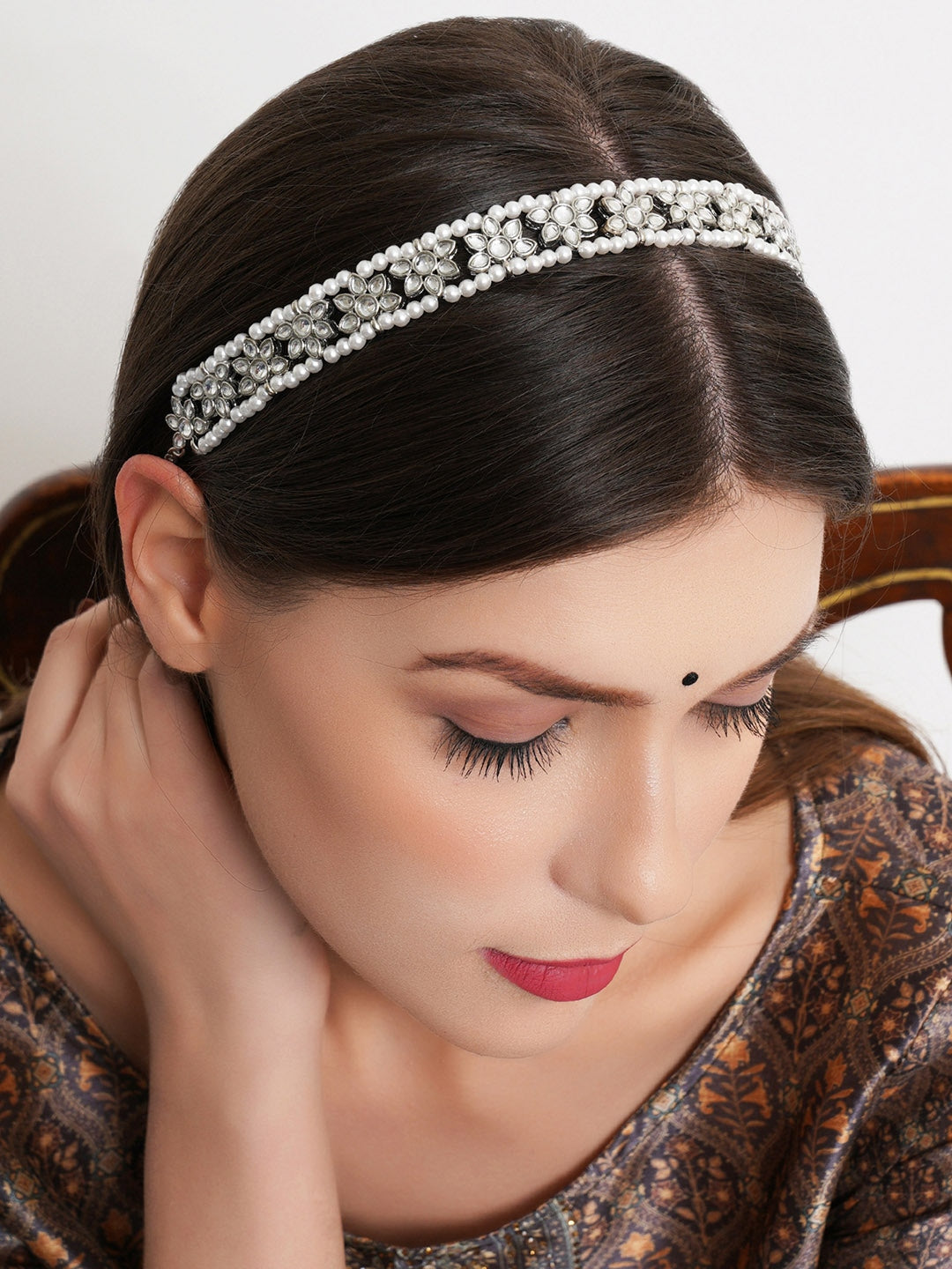 PRODUCT DETAILS Silver-toned Oxidised Kundan HairbandSize & FitHairband Length: 31cm, Width: 3cmMaterial & CareMetalWipe with...