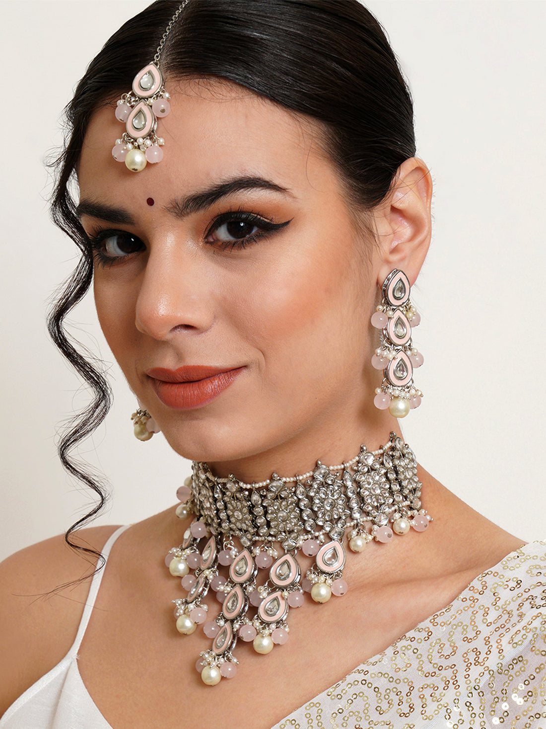 Karatcart Light Pink Beads Oxidised Silver Kundan Choker Necklace Set for Women