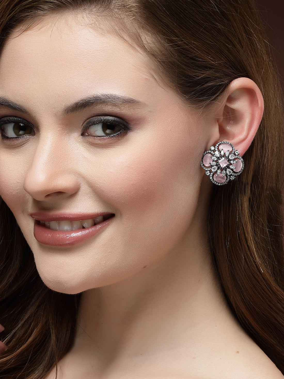Karatcart Floral Design Pink Cubic Zirconia Studded Black Silver Plated Stud Earrings for Women