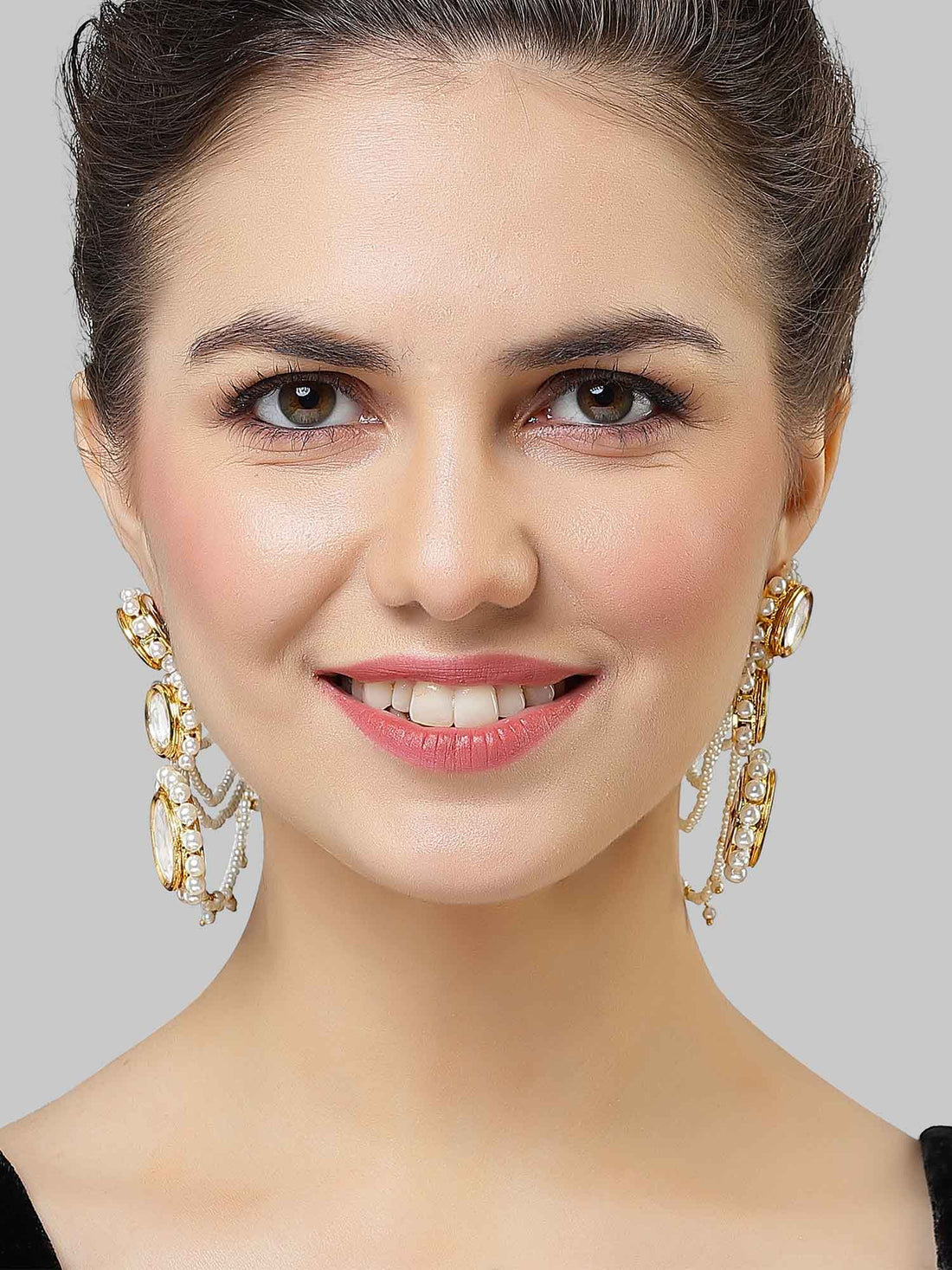 Karatcart Gold Plated Polki Kundan Pearl Kaanchain Earrings for Women