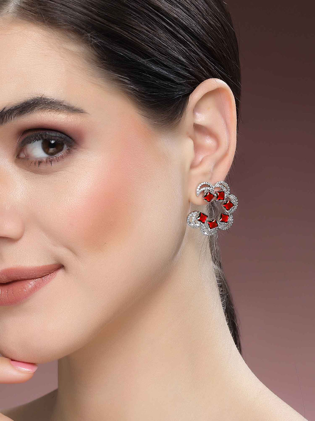 Karatcart Silver Plated Moon Design Red Cubic Zirconia Stud Earrings for Women