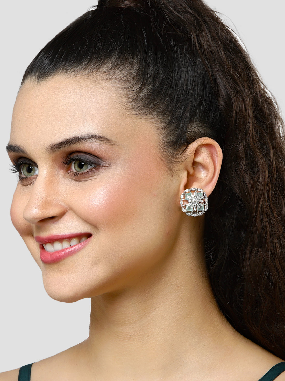 Karatcart Light Green American Diamond Studded Floral Stud Earrings for Women