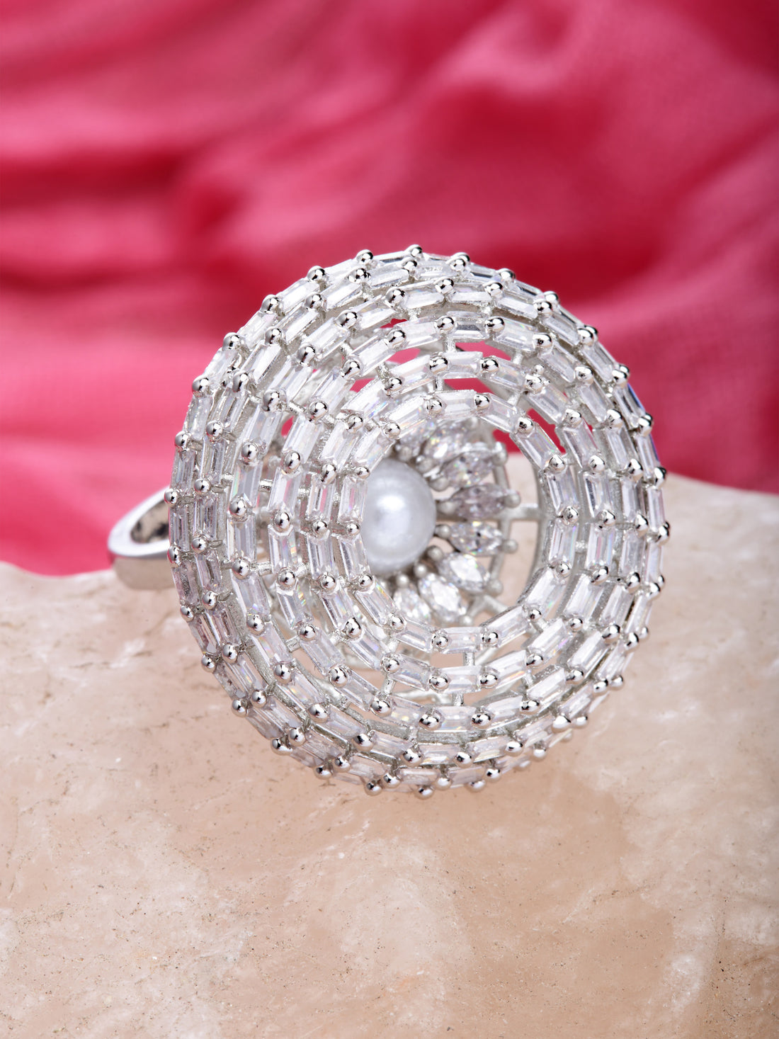 Karatcart Silver Plated Pearl Studded Cubic Zirconia Cocktail Ring for Women