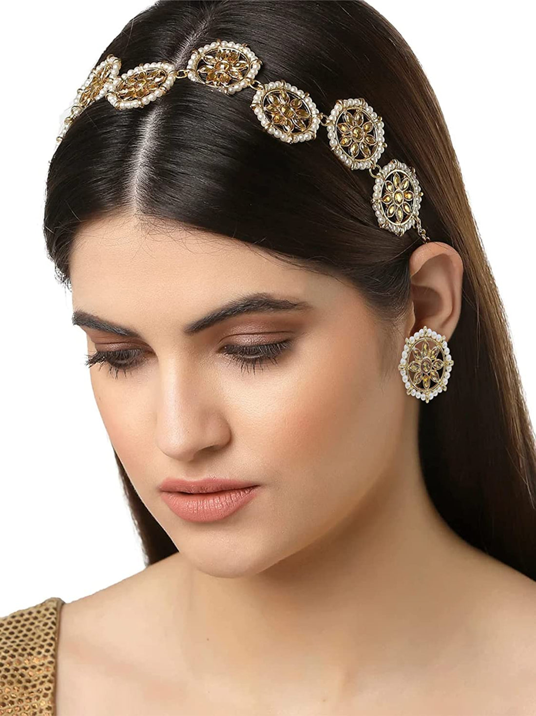 Karatcart Gold Plated Pearl and Kundan Studded Hairband with Earrings Combo for Women. Our products...
