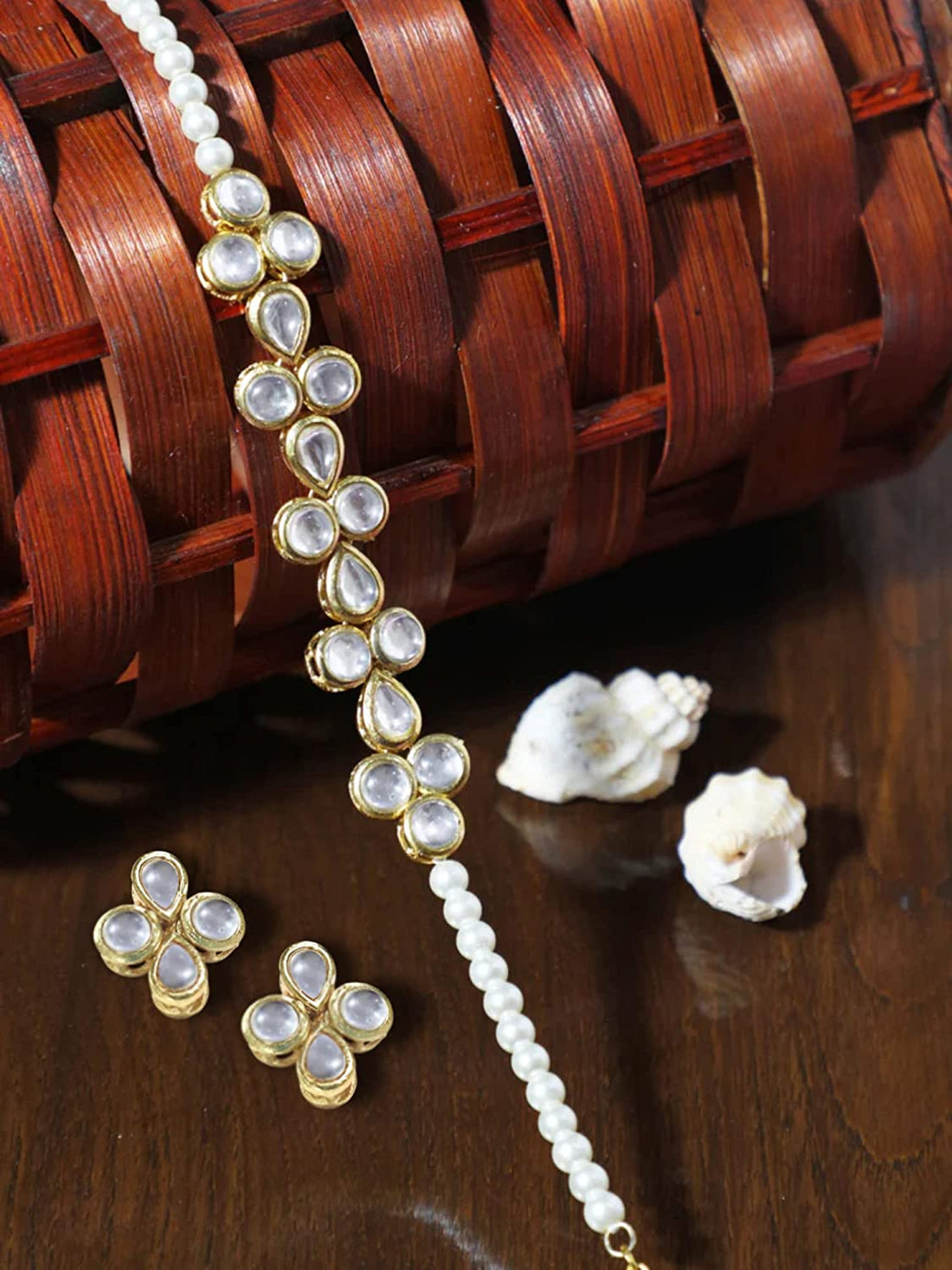 Karatcart Gold-Plated White Kundan-Studded Handcrafted Hairband with Earring Combo for Women