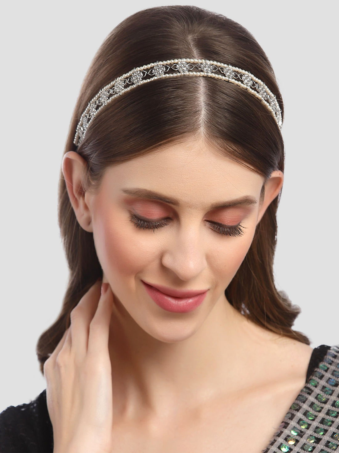 Karatcart Oxidised Silver Floral Shape Handcrafted Kundan Hairband for Women