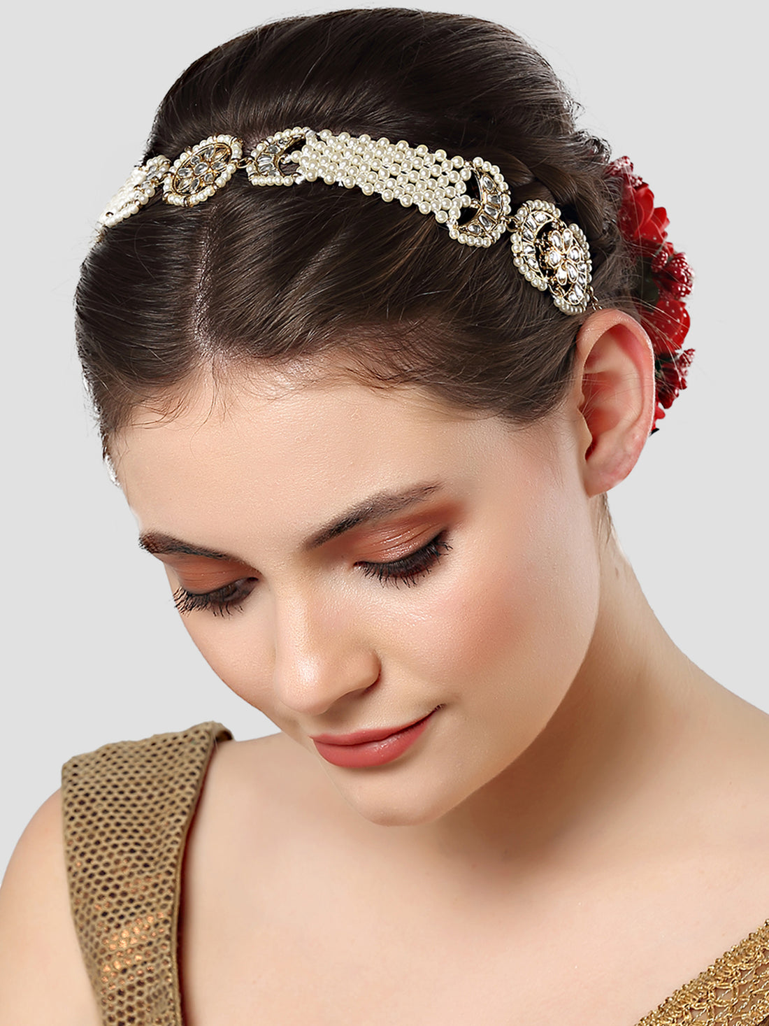 Karatcart Gold Plated Floral Pearl Beaded Kundan Hairband for Women