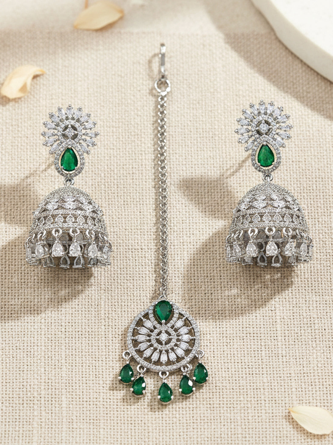 KARATCART Stunning Green American Diamond Silver-Plated Jhumka Earrings and Maangtikka Combo