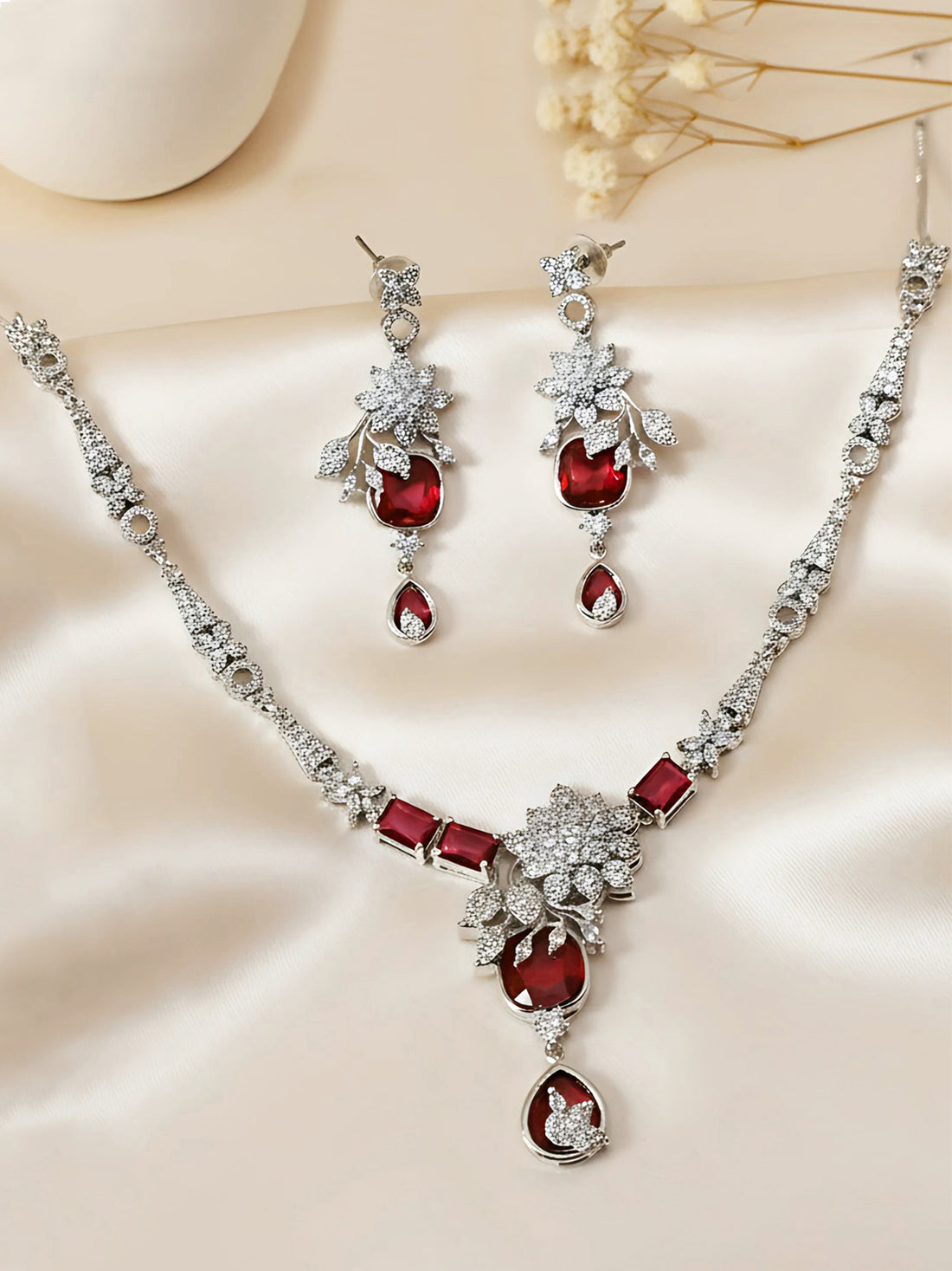 KARATCART Dazzling Red American Diamond Silver Tone Floral Jewellery Set for Women