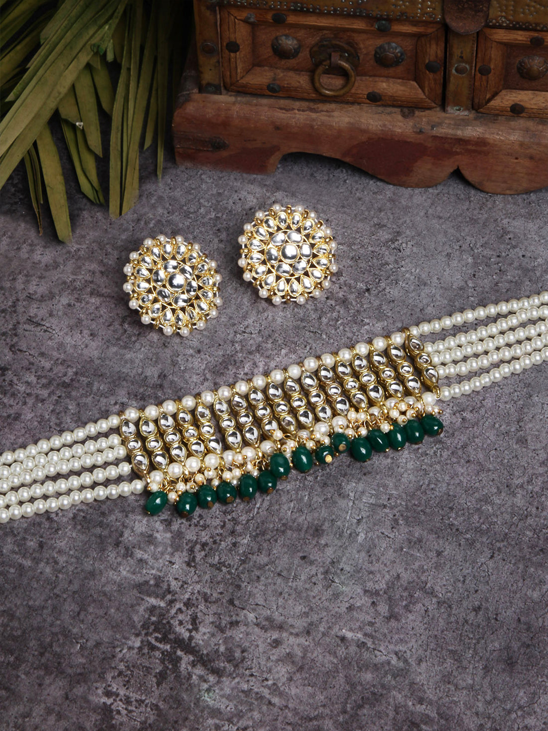 Light Green Beads Gold-Toned Kundan Studded Bridal Choker Necklace Set