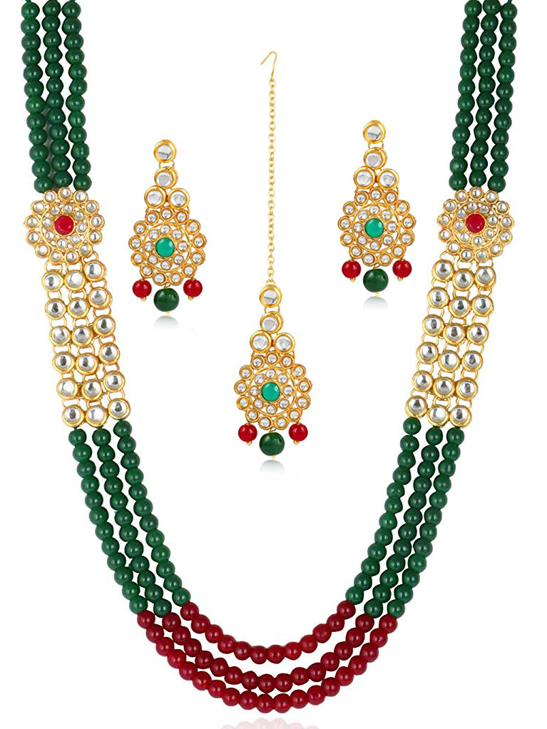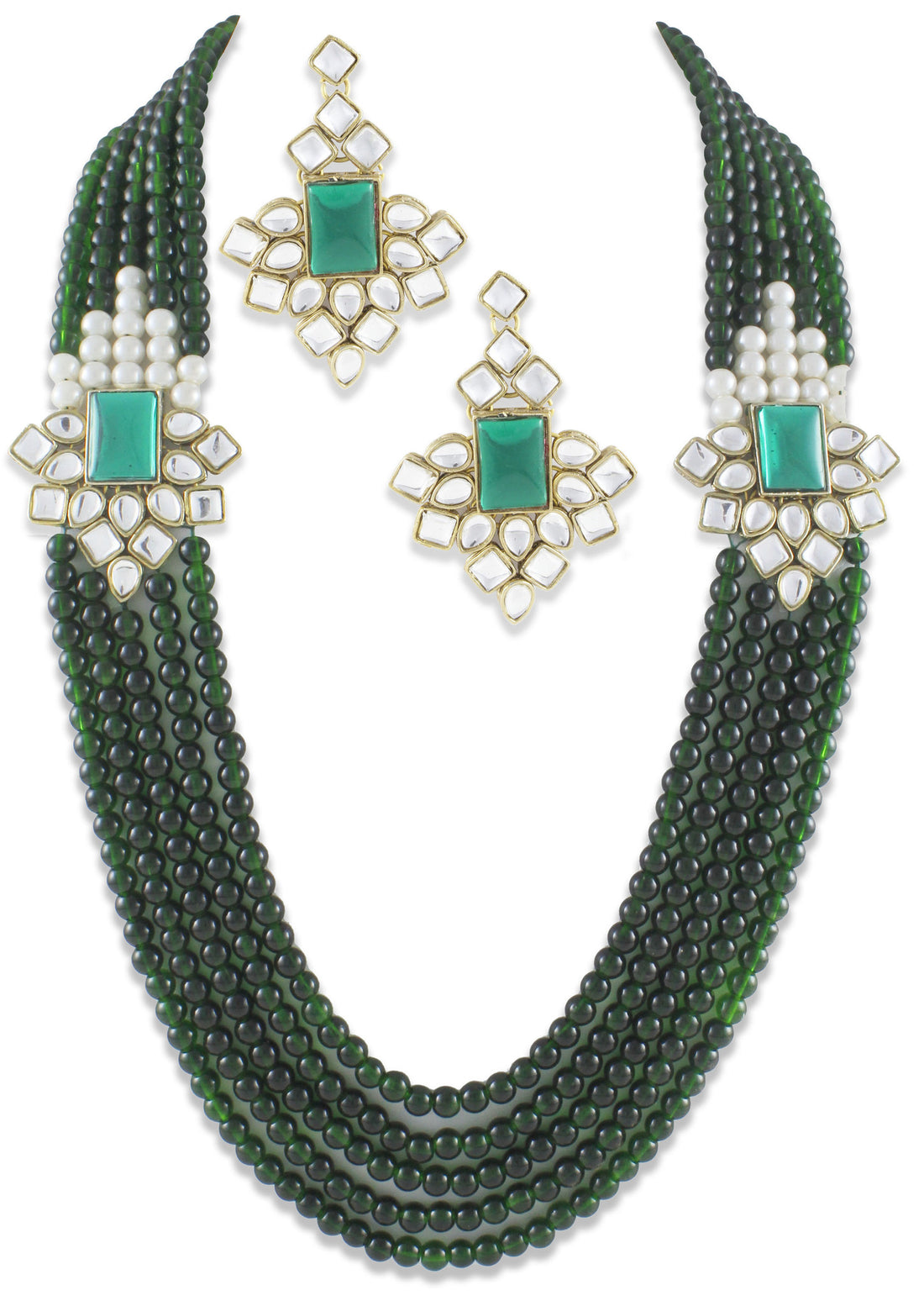 Green Multistrand Embellished Necklace Set. It's Five Layer Micro Gold Plated and Embellished with Kundan...
