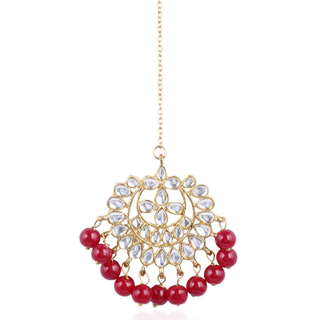 Traditional Gold Plated Red Beads Kundan Maangtikka For Women