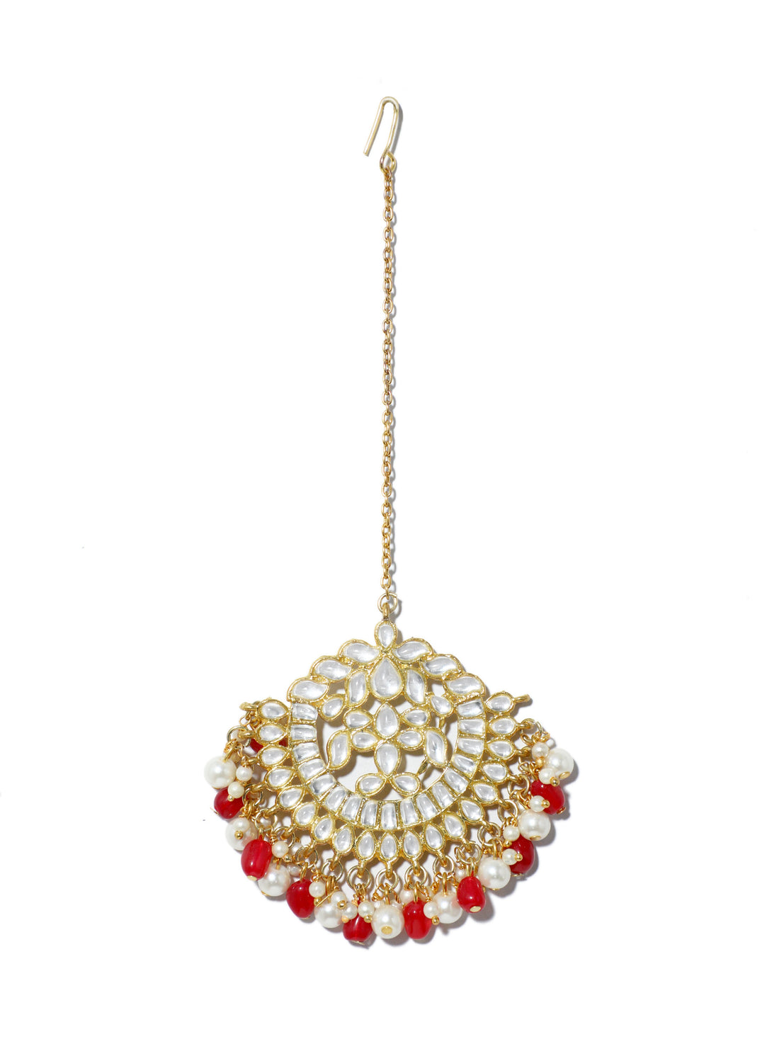 Gold Plated Red and Pearl Beads Kundan Maangtikka