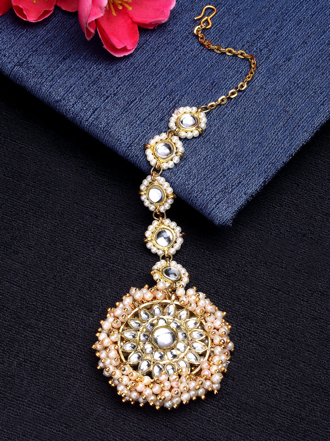 Traditional Gold Plated Pearl Beads Kundan Maangtikka For Women